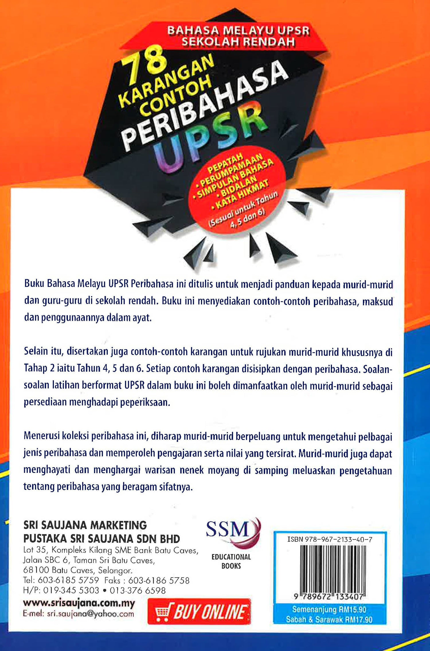 Selain itu, disertakan juga contoh-contoh karangan untuk rujukan murid-murid khususnya di Tahap 2 iaitu Tahun 4, 5 dan 6. Setiap contoh karangan disisipkan dengan peribahasa. Soalan-soalan latihan berformat UPSR dalam buku ini boleh dimanfaatkan oleh murid-murid sebagai persediaan menghadapi peperiksaan.