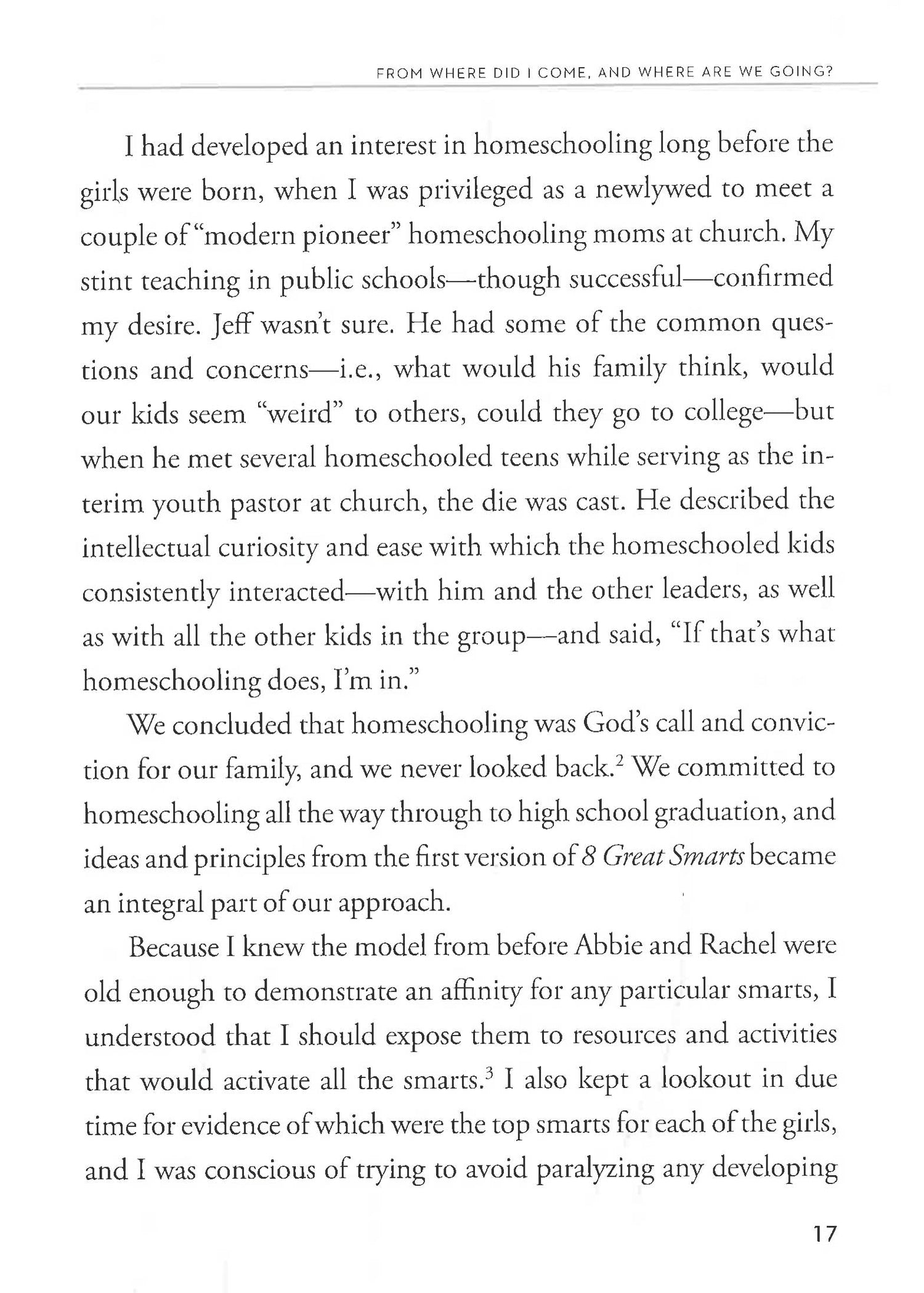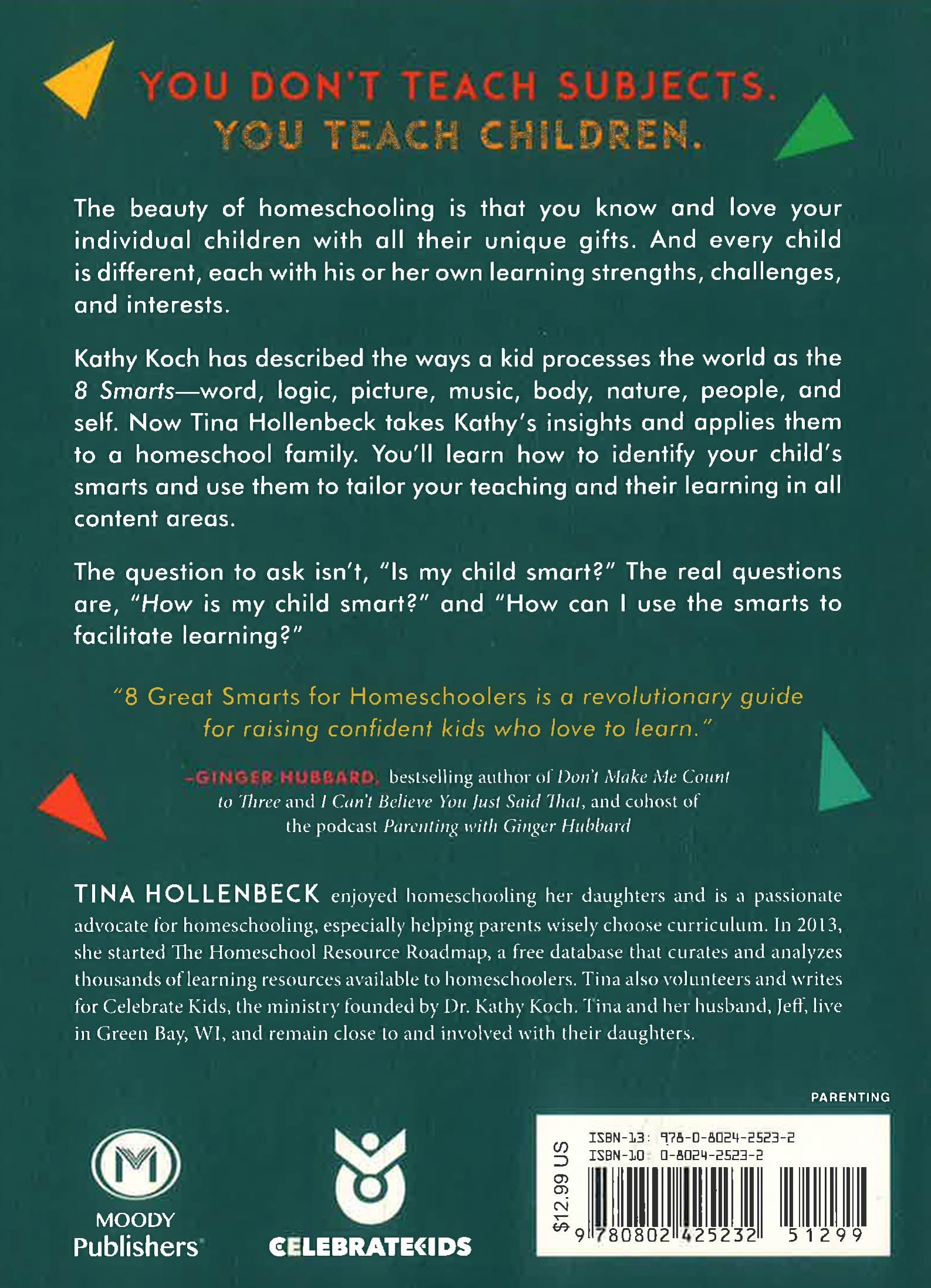 Based on the 8 Smarts identified by Kathy Koch—word, logic, picture, music, body, nature, people, and self—8 Great Smarts for Homeschooling Families tailors these ideas to the unique setting of the home classroom. Tina Hollenbeck, a leader in the home education community, applies the 8 Smarts to each division of a complete curriculum: