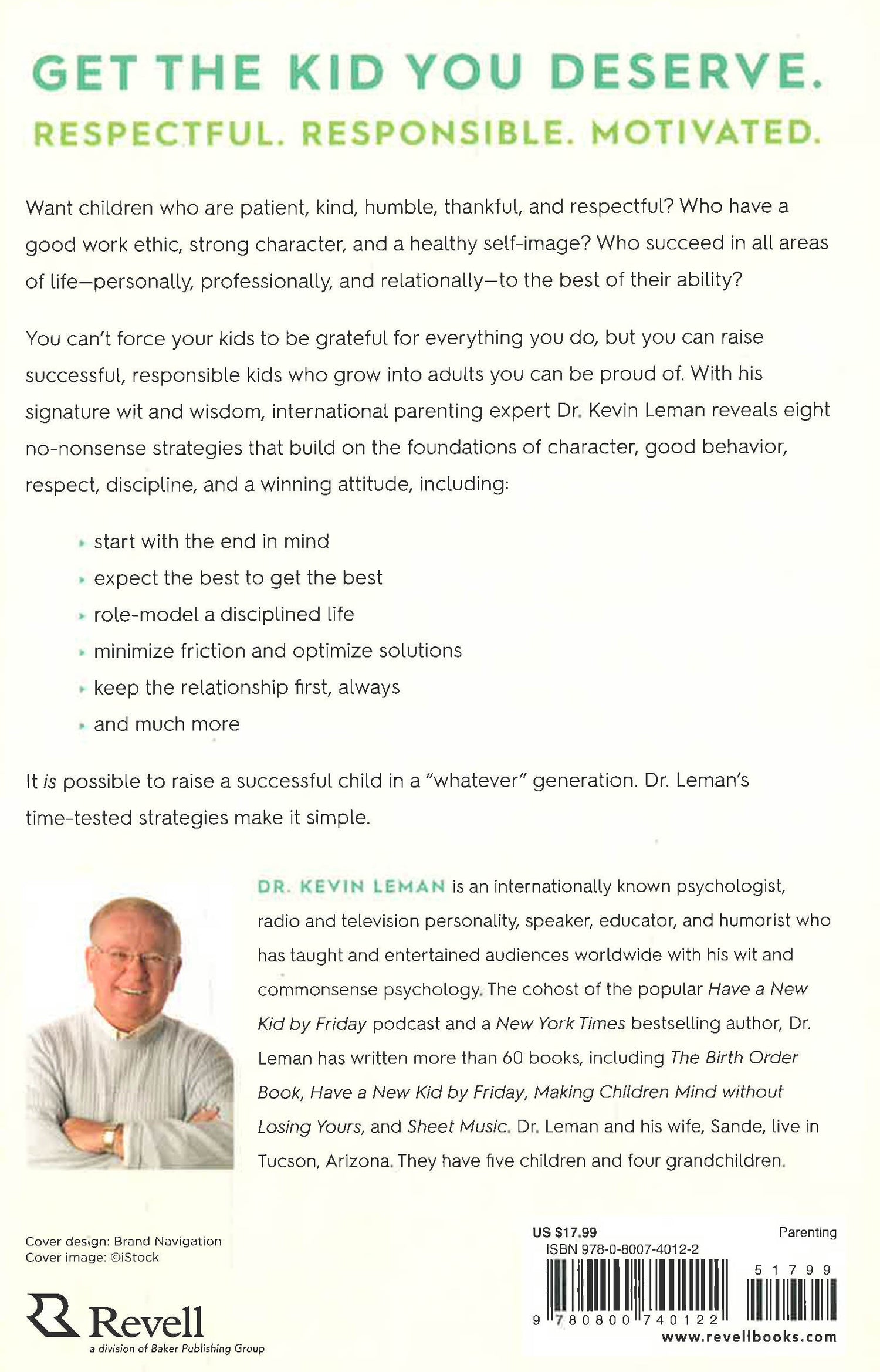 Get the Kid You Deserve. Respectful. Responsible. Motivated. Want children who are patient, kind, humble, thankful, and respectful? Who have a good work ethic, strong character, and a healthy self-image? Who succeed in all areas of life--personally, professionally, and relationally--to the best of their ability? You can't force your kids to be grateful for everything you do, but you can raise successful, responsible kids who grow into adults you can be proud of. With his signature wit and wisdom, international parenting expert Dr. Kevin Leman reveals eight no-nonsense strategies that build on the foundations of character, good behavior, respect, discipline, and a winning attitude, including: ● start with the end in mind ● expect the best to get the best ● role-model a disciplined life ● minimize friction and optimize solutions ● keep the relationship first, always ● and much more It is possible to raise a successful child in a "whatever" generation. Dr. Leman's time-tested strategies make it simple. Want a kid who ● treats you with respect? ● listens every time you talk? ● says "please" and "thank you" without prompting? ● actually likes his siblings and sticks up for them? ● does homework and chores on time? ● pitches in to clear dishes, do laundry, and keep your living space clean? ● is known for integrity and keeping promises? ● is motivated to do her best but accepts and learns from failure? ● can stand strong against any tailwinds, bullies, or competition? With 8 Secrets to Raising Successful Kids, you can rear a respectful, responsible, hardworking child in today's tumultuous world--one who will confidently blaze a unique trail to adulthood. I guarantee it.