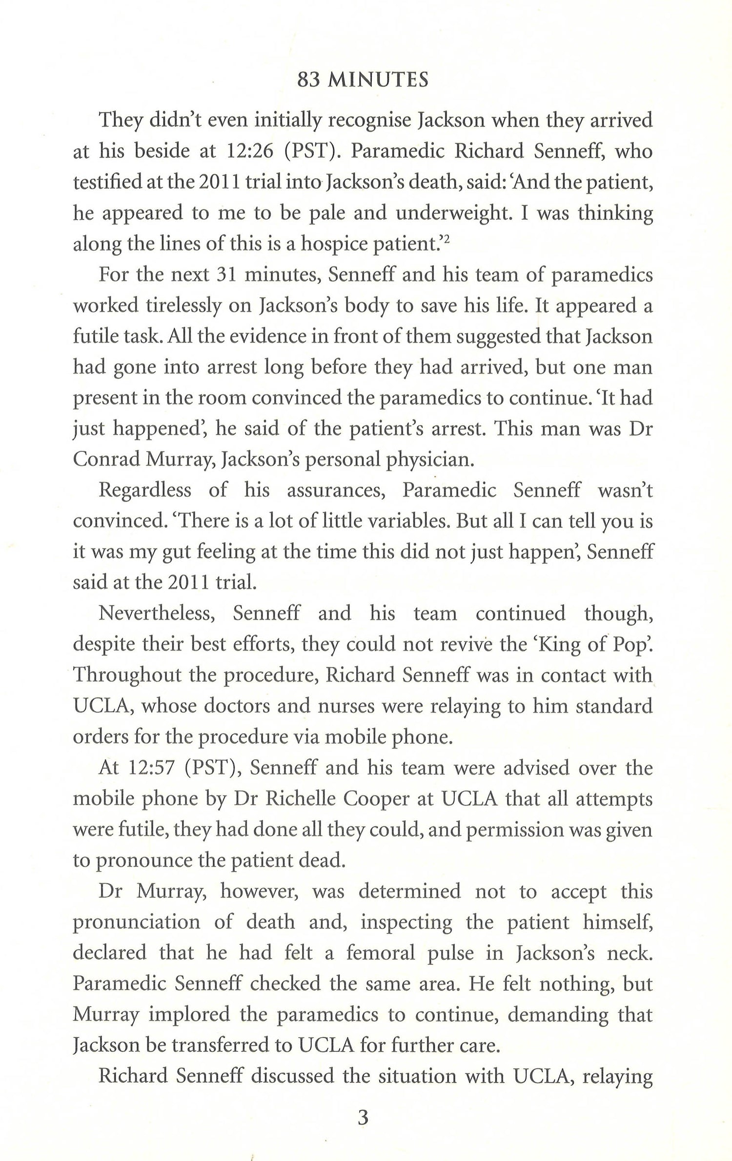 83 Minutes is the definitive account of the events that led to Jackson's tragic death and a powerful retelling of the truth behind the rumours.On June 25th, 2009, the world was rocked by the tragic, shocking news that Michael Jackson had died. The biggest and most influential music icon since Elvis Presley, Jackson was pronounced dead on arrival at a Los Angeles hospital. He was 50 years old. As the news reverberated around the world, it was soon accompanied by even more shocking and controversial information: that Jackson had died a whole 83 minutes before his personal physician, Dr Conrad Murray, put a 911 call in to emergency services.Based on official court documents, this comprehensive and compelling study of those all-important minutes lays bare everything from the incredible backgrounds of each individual surrounding the musical genius and the immense pressure to get him to perform to the facts behind the cocktail of drugs Murray employed to keep his patient alive and the frantic attempts to cover his tracks before the truth could be revealed.