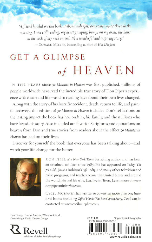 This inspiring and encouraging account continues to touch and comfort hundreds of thousands of people around the world as it offers a glimpse of inexpressible heavenly bliss.In the ten years since 90 Minutes in Heaven was published, millions of people worldwide have read the incredible true story of Don Piper's experience with death and life--and in reading they have found their own lives changed. After a semi-truck collided with Don Piper's car, he was pronounced dead at the scene. For the next ninety minutes, he experienced the glories of heaven. Back on earth, a passing minister felt led to stop and pray for the accident victim even though he was told Piper was dead. Miraculously, Piper came back to life, and the pleasure of heaven was replaced by a long and painful recovery. With a personal update from Don on the impact the book has had on him, his family, and the millions who have heard his story, even those who have read the original book will want to be part of the continuing story of 90 Minutes in Heaven with this new edition.