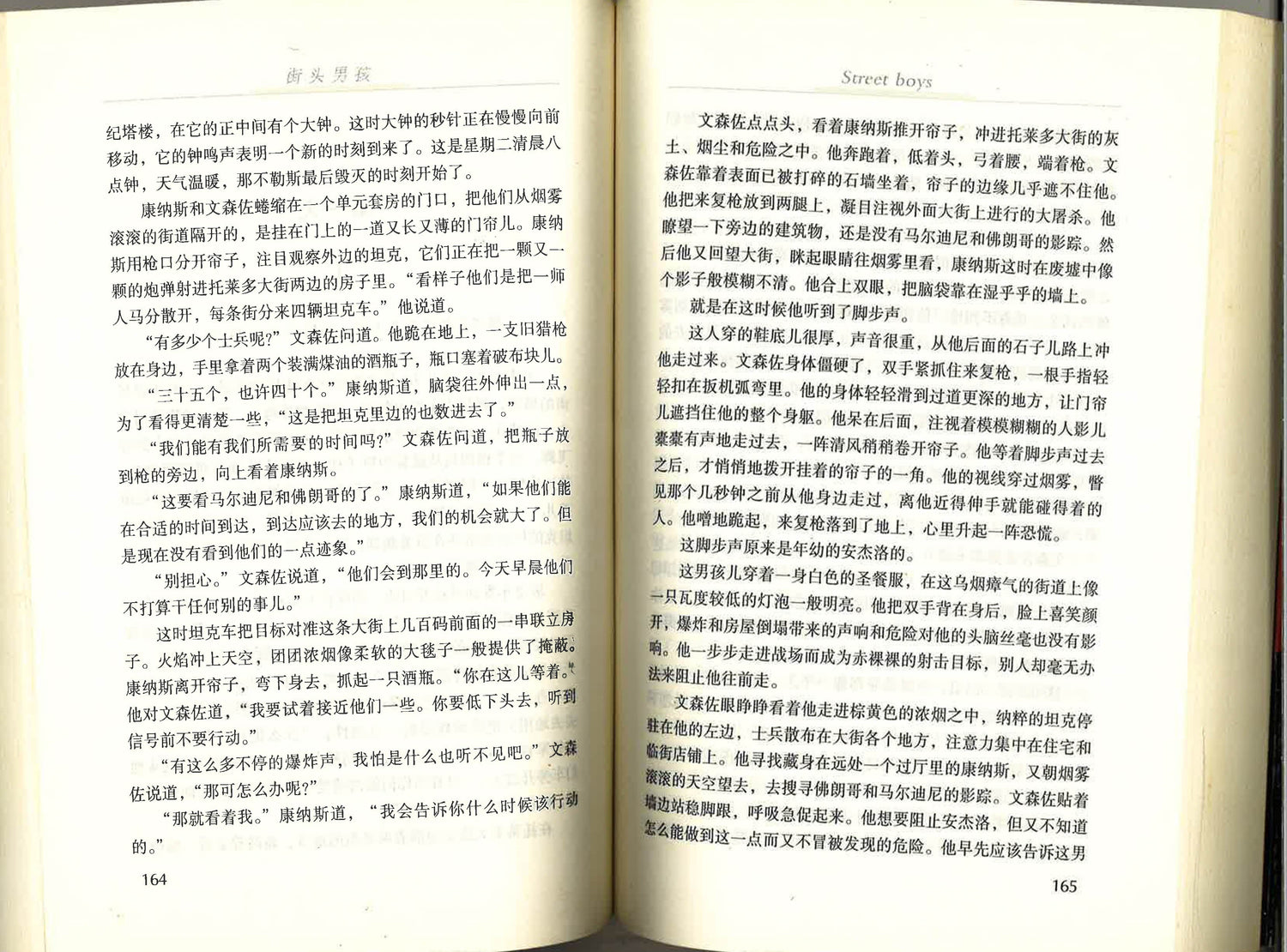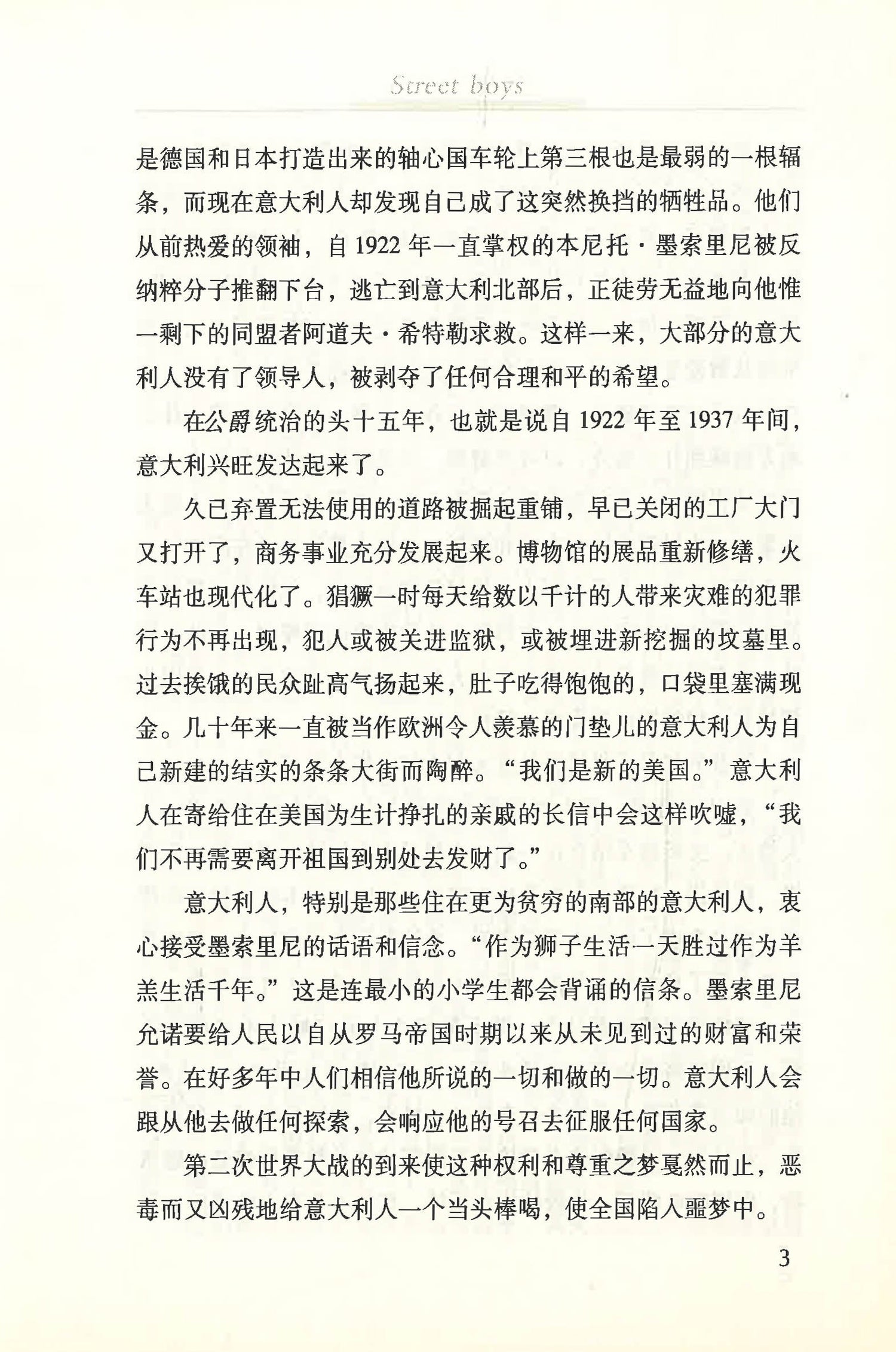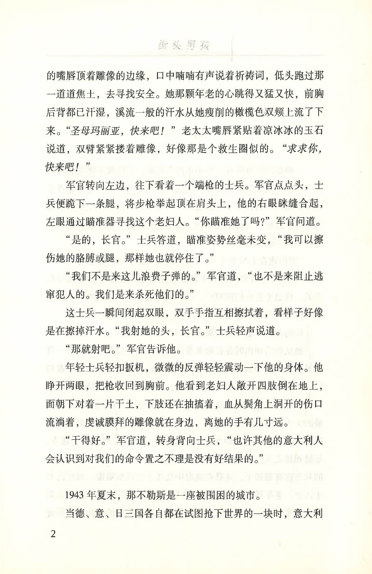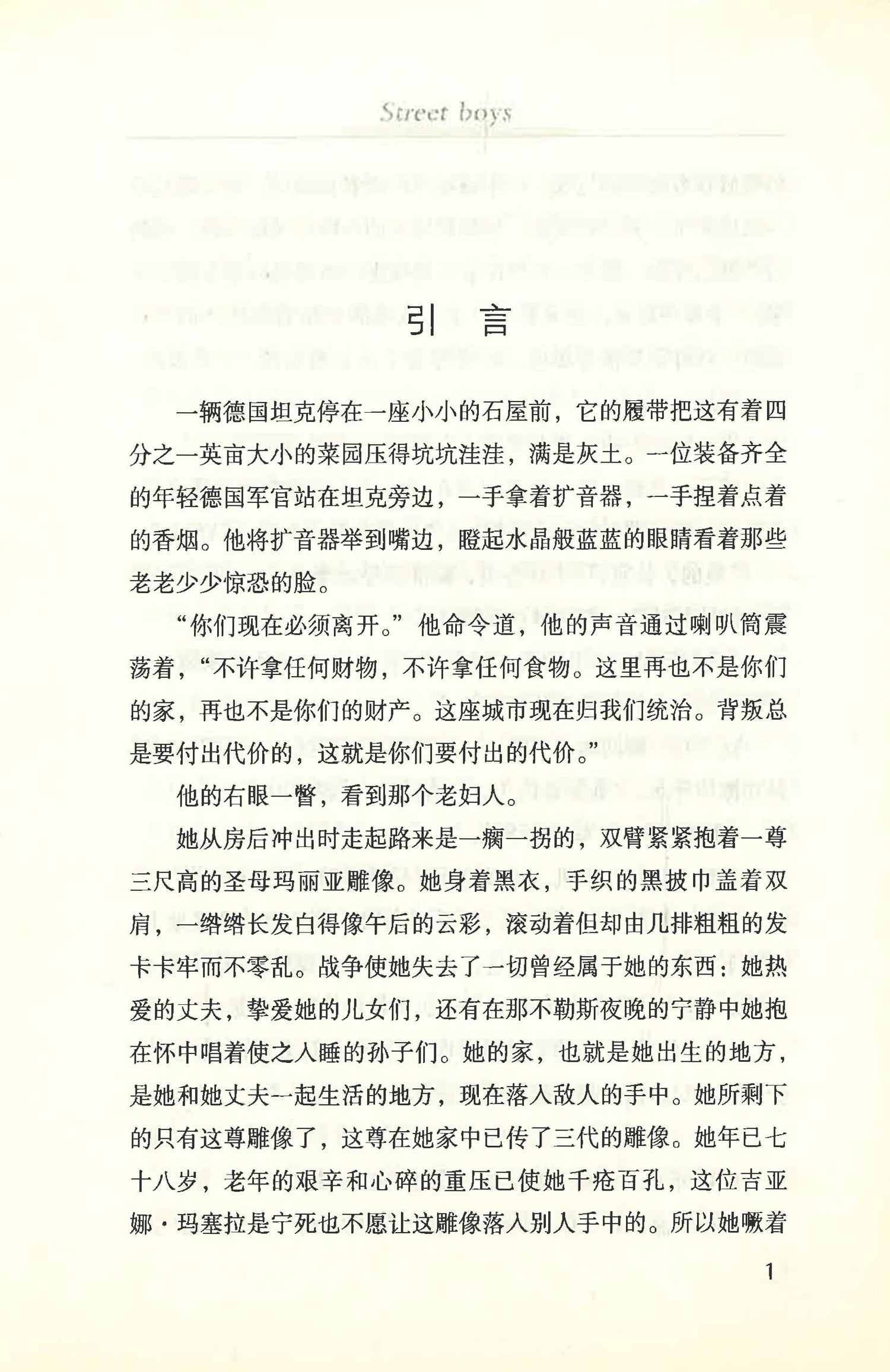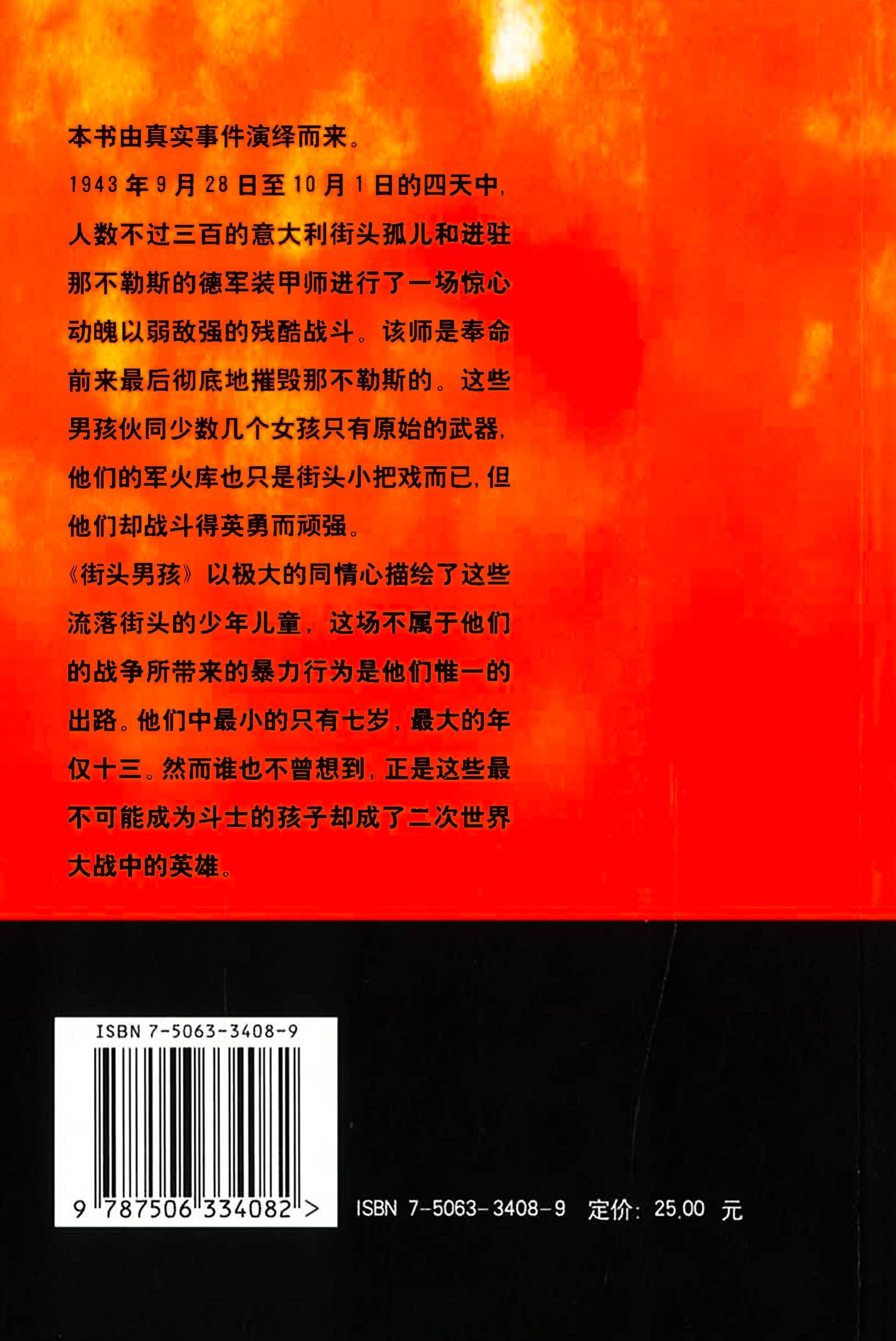 《街头男孩》是2006年作家出版社出版的图书,作者是卡客特拉。该书是由真实事件演绎而来。1943年9月28日至10月1日的四天中,人数不过三百的意大利街头孤儿和进驻那不勒斯的德军装甲师进行了惊心动魄、以弱斗强的残酷战斗。这些男孩伙同少数几个女孩只有原始的武器,他们的军火库也只是街头小把戏而已,但他们却战斗得英勇而顽强。该书以极大的同情心描绘了这些流落街头的少年儿童。他们中最小的只有七岁,最大的年仅十三。然而谁也不曾想到,正是这些最不可能成为斗士的孩子却成了二次世界大战中的英雄。