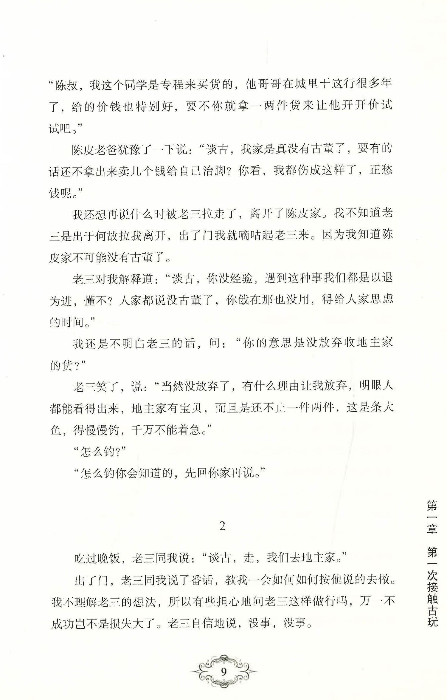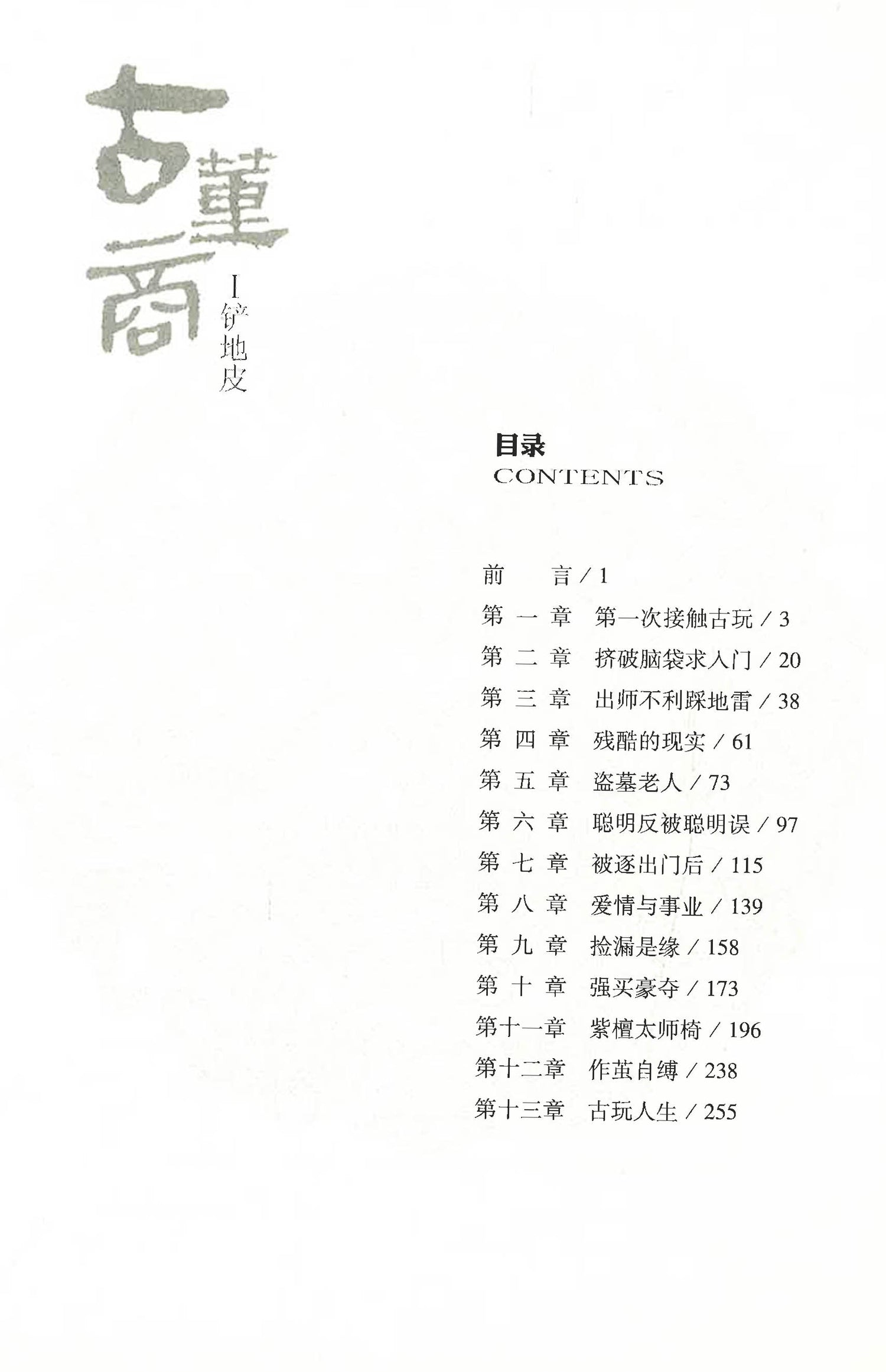 本书主要讲述了小 董商人谈 初入 玩行业“铲地皮”的往 ,说的是跑乡下收 董的的各种斗智斗勇的经历,展示出鲜为人知的 玩来源,间夹着各类 玩知识。让读者边听故 边学 玩知识两不误。 套书将通过 节曲折的故 ,深入揭秘 玩市场的货源、规矩、交易潜在规则, 玩的分类及市场价值, 玩背后的黑幕及正面的故 ,从而告诉人们玩 玩所必须的一 正确心态和投资 玩的风险,提 玩收藏的技巧。钱没了可以再挣,而艺术无价、历史无价。把散落在民间的文物集藏、保护,就是把民族的根留住,把民族的魂世 传承。