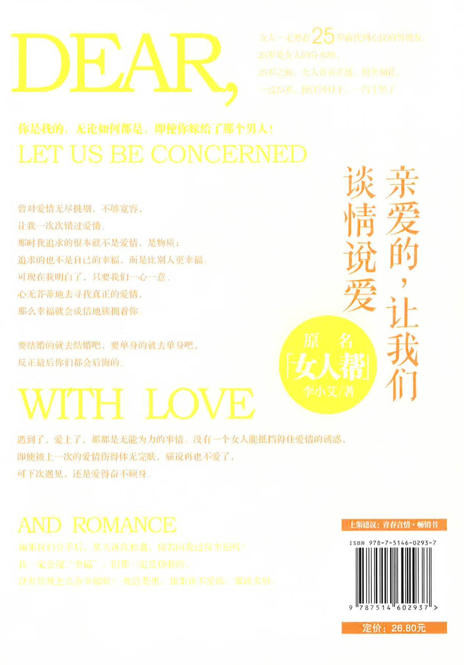 《亲爱的,让我们谈情说爱》,原名《女人帮》,是一部都市情感小说,讲的是四个都市女性在充满欲望和诱惑的大都市里,寻找真正爱情和归宿的故事,意在揭开爱情的本质和价值。小说以四个性格迥异的剩女为叙事主线,讲述了她们的一场场惊心动魄的“情爱历险”,也茫然,也绝望,但靠着彼此间牢固的友谊,向着理想爱情努力奋进。经过一场葬礼和一场婚礼后,最终让她们明白有车有房只能给人一时的安全感,但唯有真爱才能给人一辈子的幸福感。