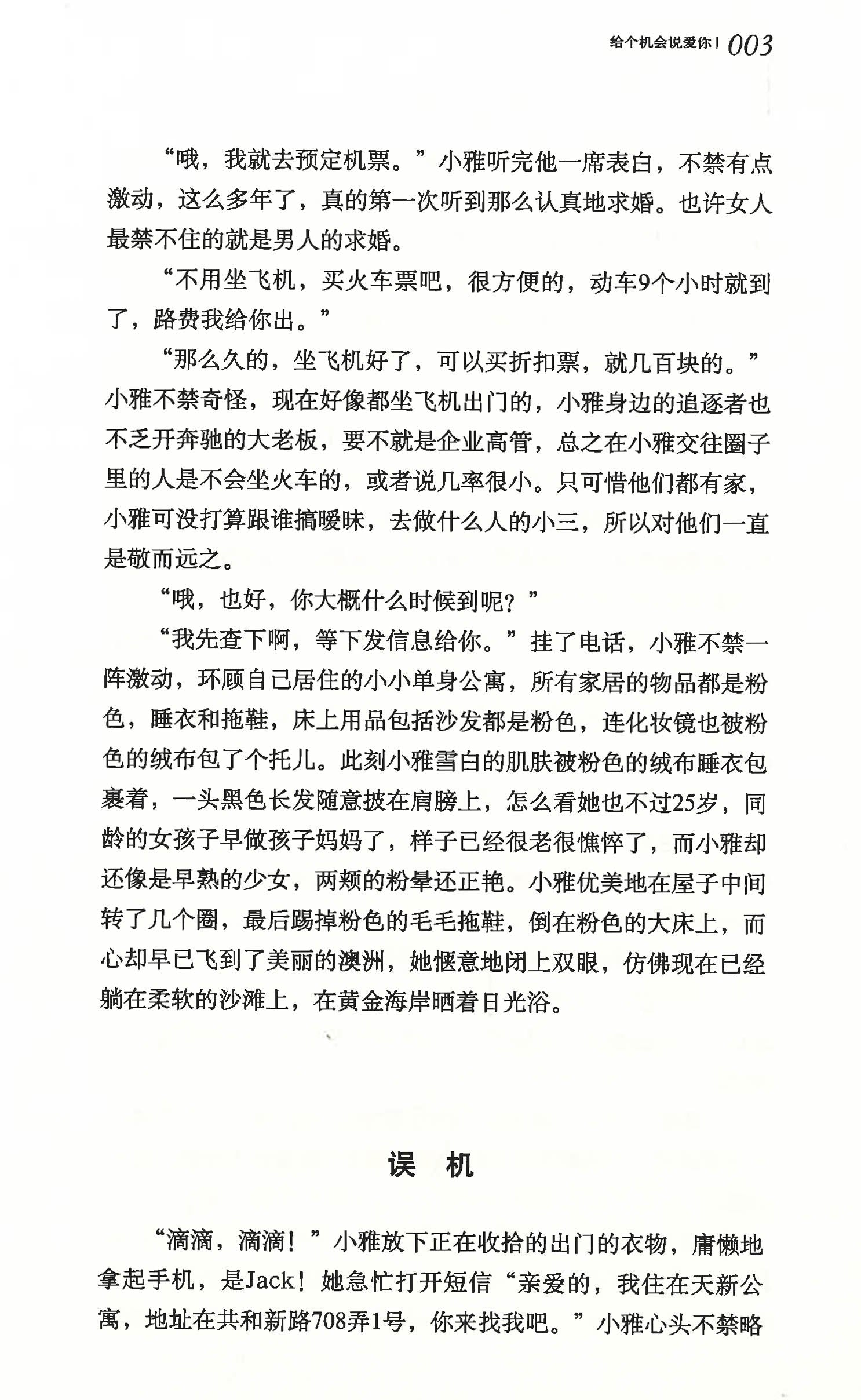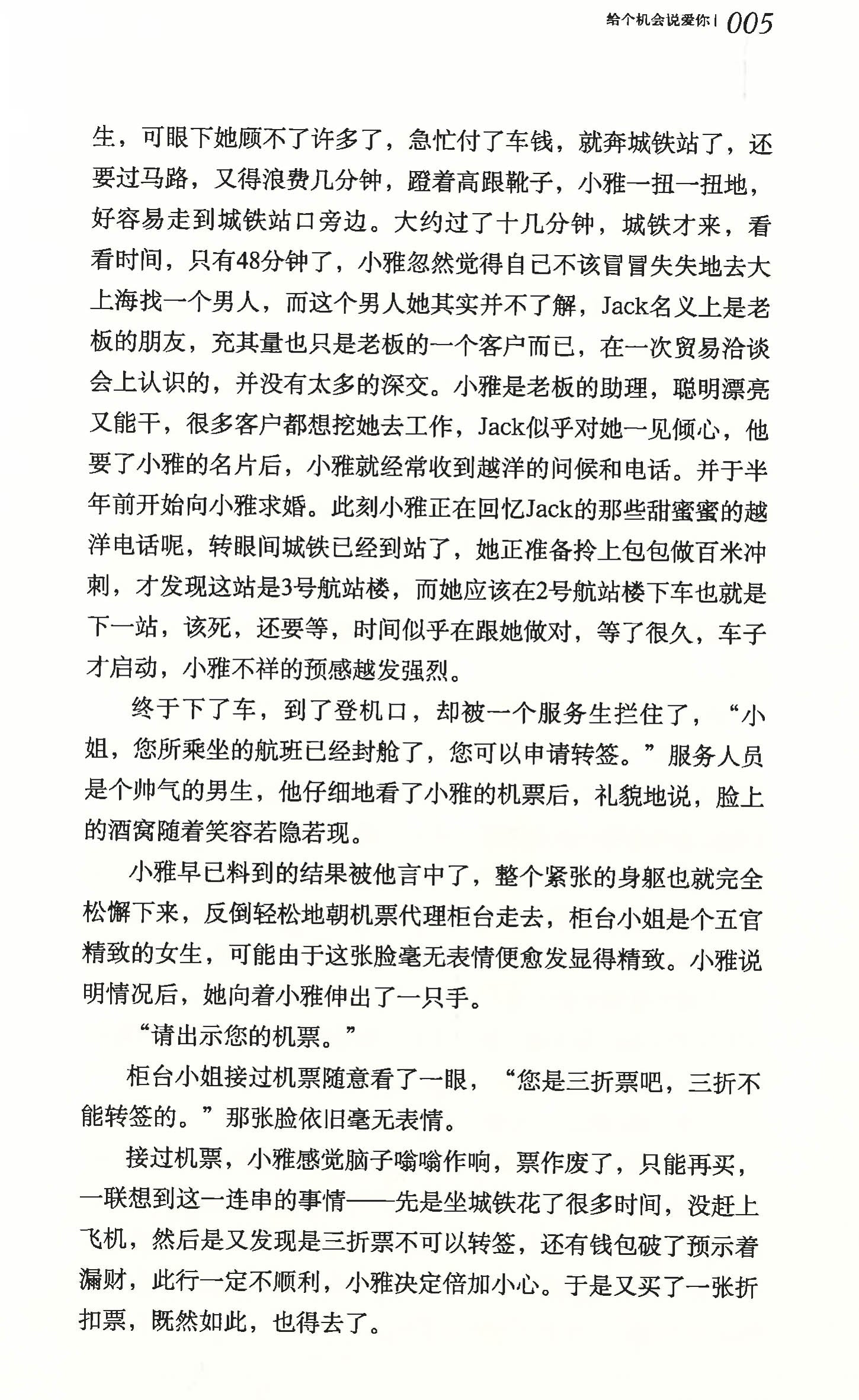 《给个机会说爱你:今天,你相亲了吗?》塑造了一个具有代表性的超级剩女,林小雅,详细讲述了林小雅的每一个有趣的相亲故事,故事基调轻松并带有小小的幽默。不甘心被剩下的大龄美女林小雅对待爱情,对待婚姻的态度优势怎样?现代都会剩女对婚姻的态度又是怎样呢,相信在书中都能找到适合自己的答案和共鸣点!
