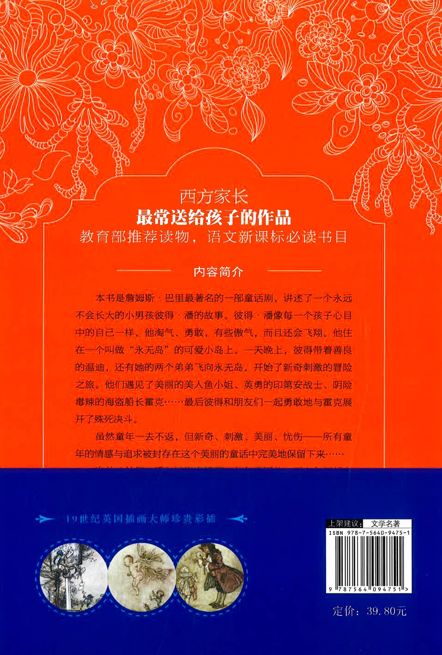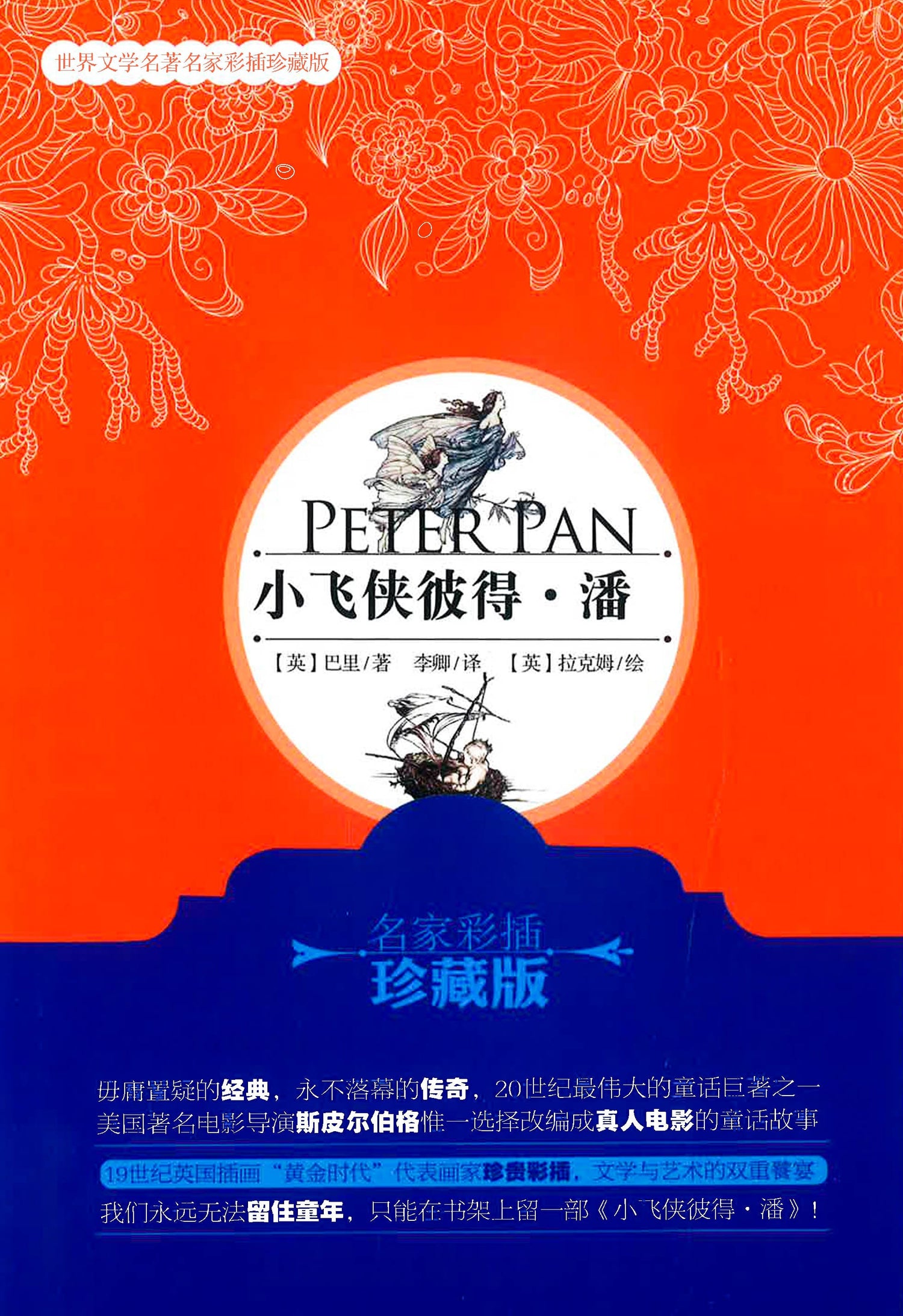 《小飞侠彼得·潘(名家彩插珍藏版)》是詹姆斯。巴里最著名的一部童话剧。讲述了一个永远不会长大的小男孩彼得·潘的故事。彼得·潘是一个小男孩,他像每一个童年的孩子心目中的自己一样,淘气、勇敢、有些傲气,而且还会飞翔。他住在一个叫做“永无岛”的可爱小岛上。一天晚上,彼得带着善良的温迪,还有她的两个弟弟飞向永无岛,开始了新奇刺激的冒险之旅。他们遇见了美丽的美人鱼小姐、英勇的印第安战士、阴险毒辣的海盗船长霍克……最后彼得和朋友们一起勇敢地与霍克展开了殊死决斗。