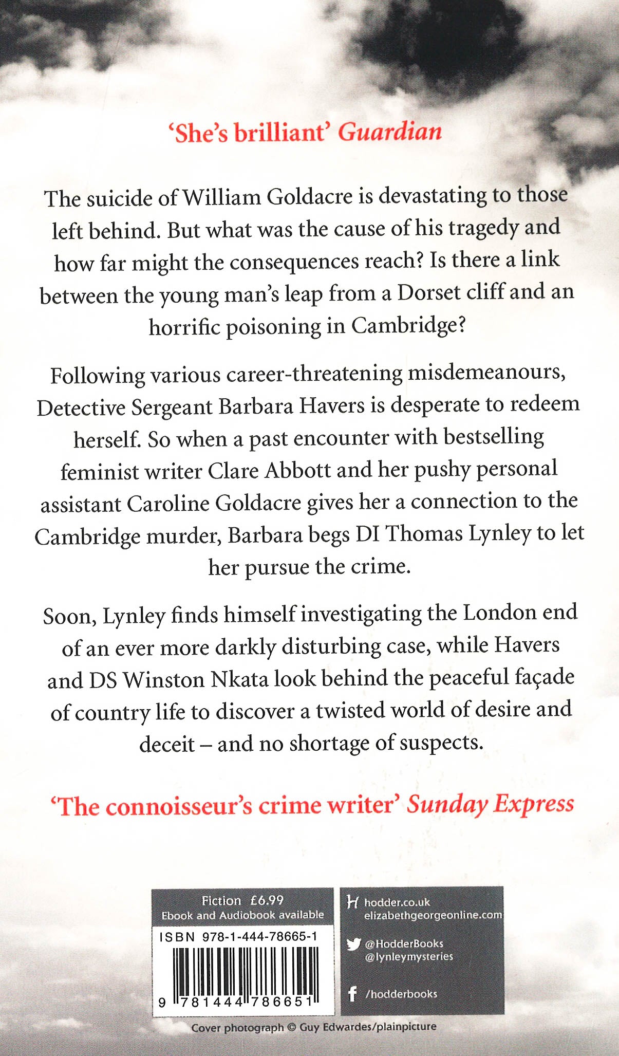Inspector Lynley investigates the London end of an ever more darkly disturbing case, with Barbara Havers and Winston Nkata looking behind the peaceful facade of country life to discover a twisted world of desire and deceit.The suicide of William Goldacre is devastating to those left behind. But what was the cause of his tragedy and how far might the consequences reach? Is there a link between the young man's leap from a Dorset cliff and a horrific poisoning in Cambridge?Following various career-threatening misdemeanours, Detective Sergeant Barbara Havers is desperate to redeem herself. So when a past encounter with bestselling feminist writer Clare Abbott and her pushy personal assistant Caroline Goldacre gives her a connection to the Cambridge murder, Barbara begs DI Thomas Lynley to let her pursue the crime.Full of shocks, intensity and suspense from first page to last, A Banquet of Consequences reveals both Lynley and Havers under pressure, and author Elizabeth George writing at the very height of her exceptional powers.