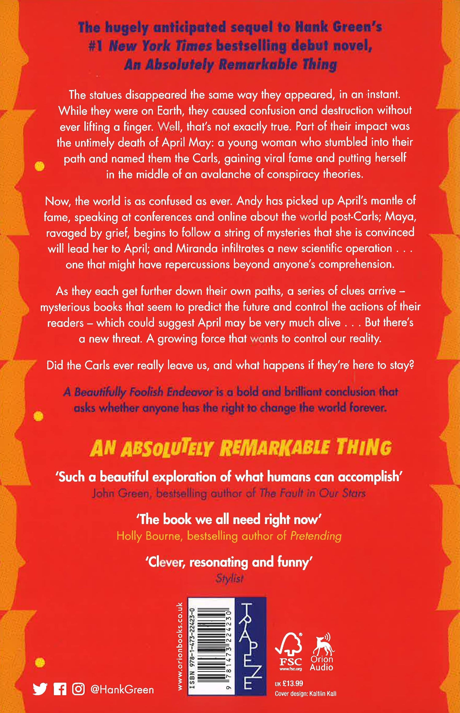 Adventurous, witty and compelling' Library Journal (starred review)The hugely anticipated sequel to Hank Green's #1 New York Times bestselling debut novel, An Absolutely Remarkable ThingThe statutes disappeared the same way they appeared, in an instant. While they were on Earth, they caused confusion and destruction without ever lifting a finger. Well, that's not exactly true. Part of their impact was the untimely death of April May: a young woman who stumbled into their path and named them the Carls, gaining viral fame and putting herself in the middle of an avalanche of conspiracy theories. Now, the world is as confused as ever. Andy has picked up April's mantle of fame, speaking at conferences and online about the world post-Carls; Maya, ravaged by grief, begins to follow a string of mysteries that she is convinced will lead her to April; and Miranda infiltrates a new scientific operation . . . one that might have repercussions beyond anyone's comprehension.As they each get further down their own paths, a series of clues arrive - mysterious books that seem to predict the future and control the actions of their readers - which seem to suggest April may be very much alive . . . But there's a new threat. A growing force that wants to control our reality. Did the Carls ever really leave us, and what happens if they're here to stay? A Beautifully Foolish Endeavor is a bold and brilliant conclusion that asks whether anyone has the right to change the world forever. 'A raucous, boldly inventive tale' Booklist (starred review)'A hopeful read that provides a Black Mirror-like warning of new technology without the heavy feeling of dread' USA Today
