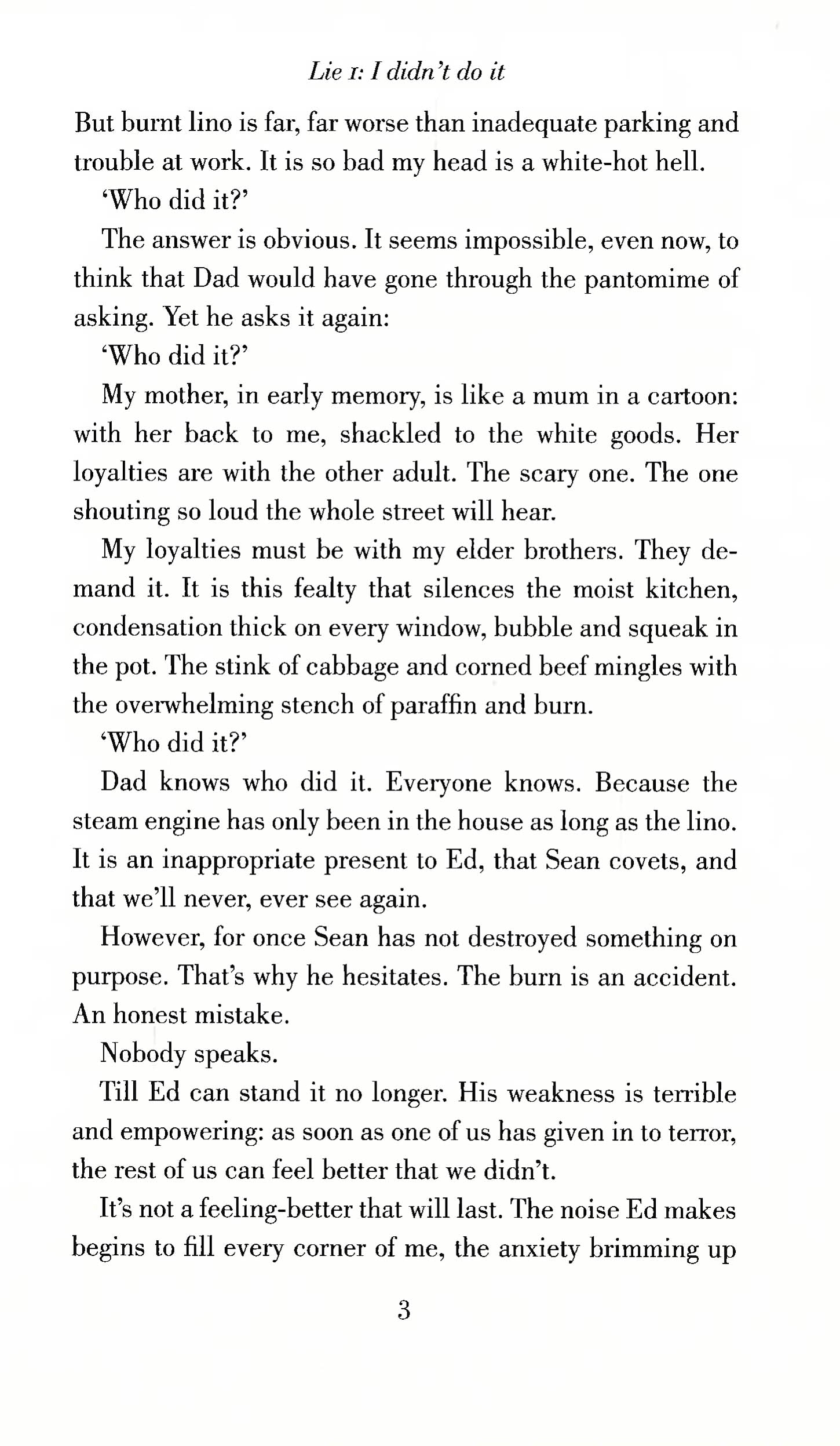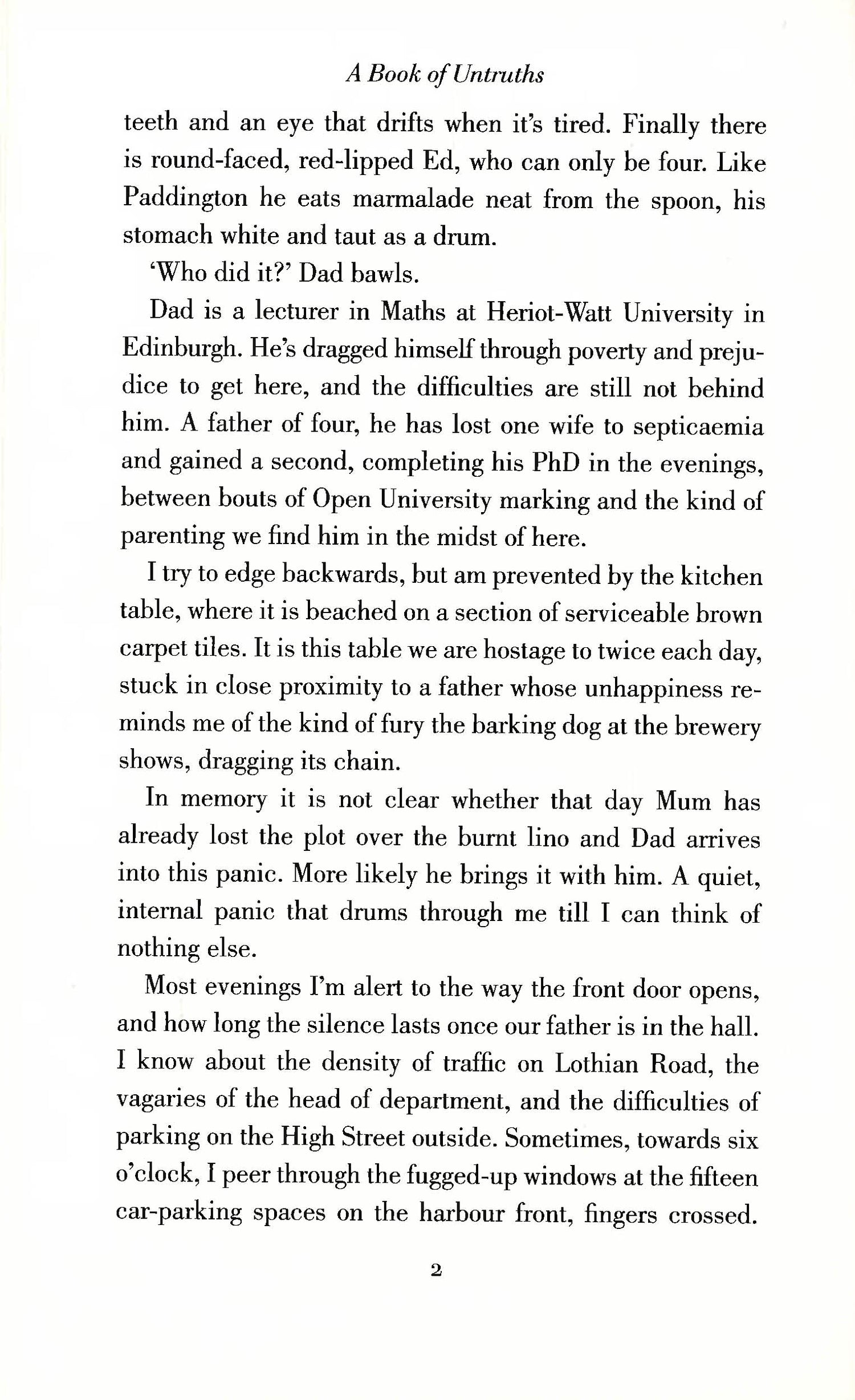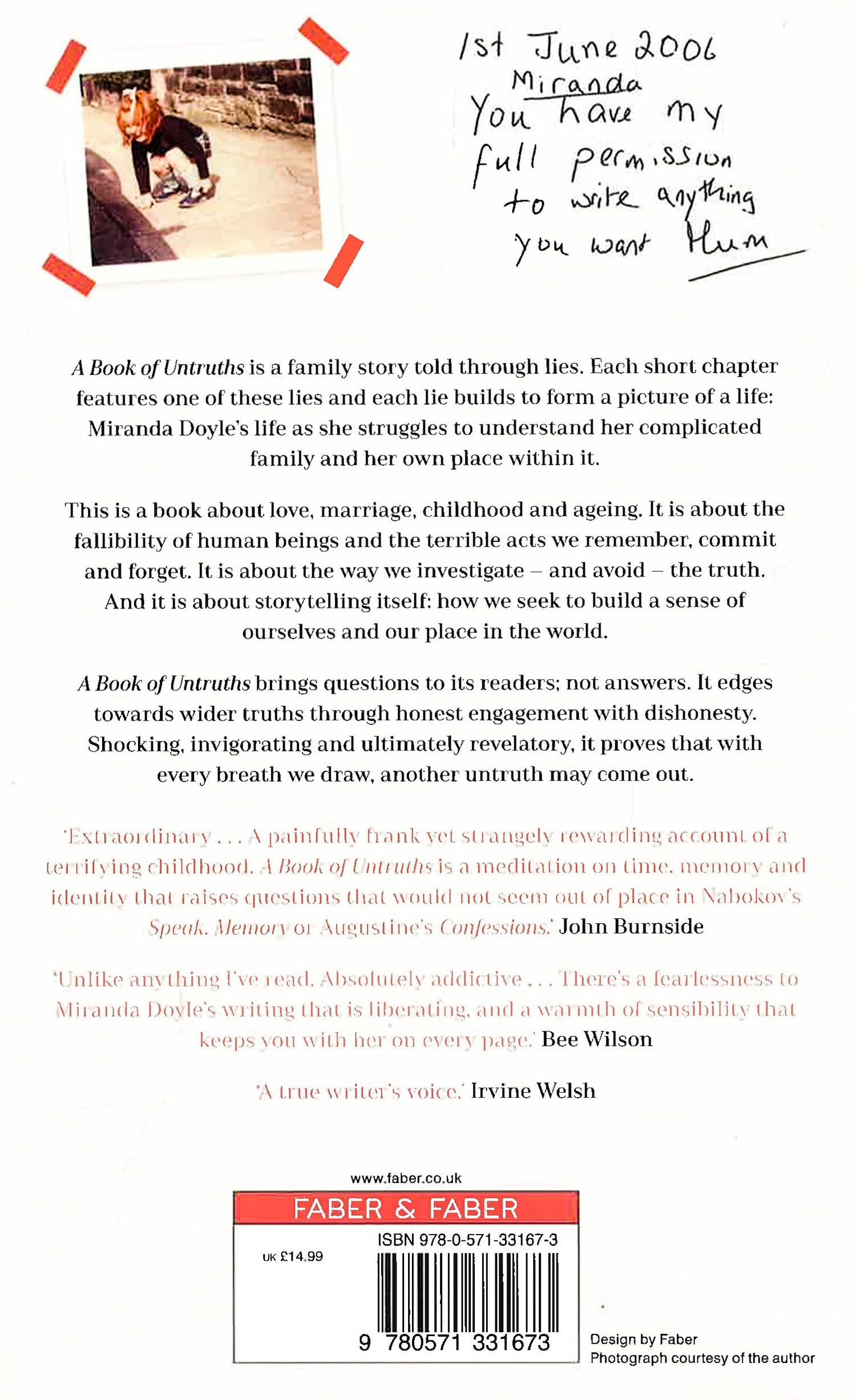 A Book of Untruths is a family story told through a series of lies. Each short chapter features one of these lies and each lie builds to form a picture of a life-Miranda Doyle's life as she struggles to understand her complicated family and her own place within it.