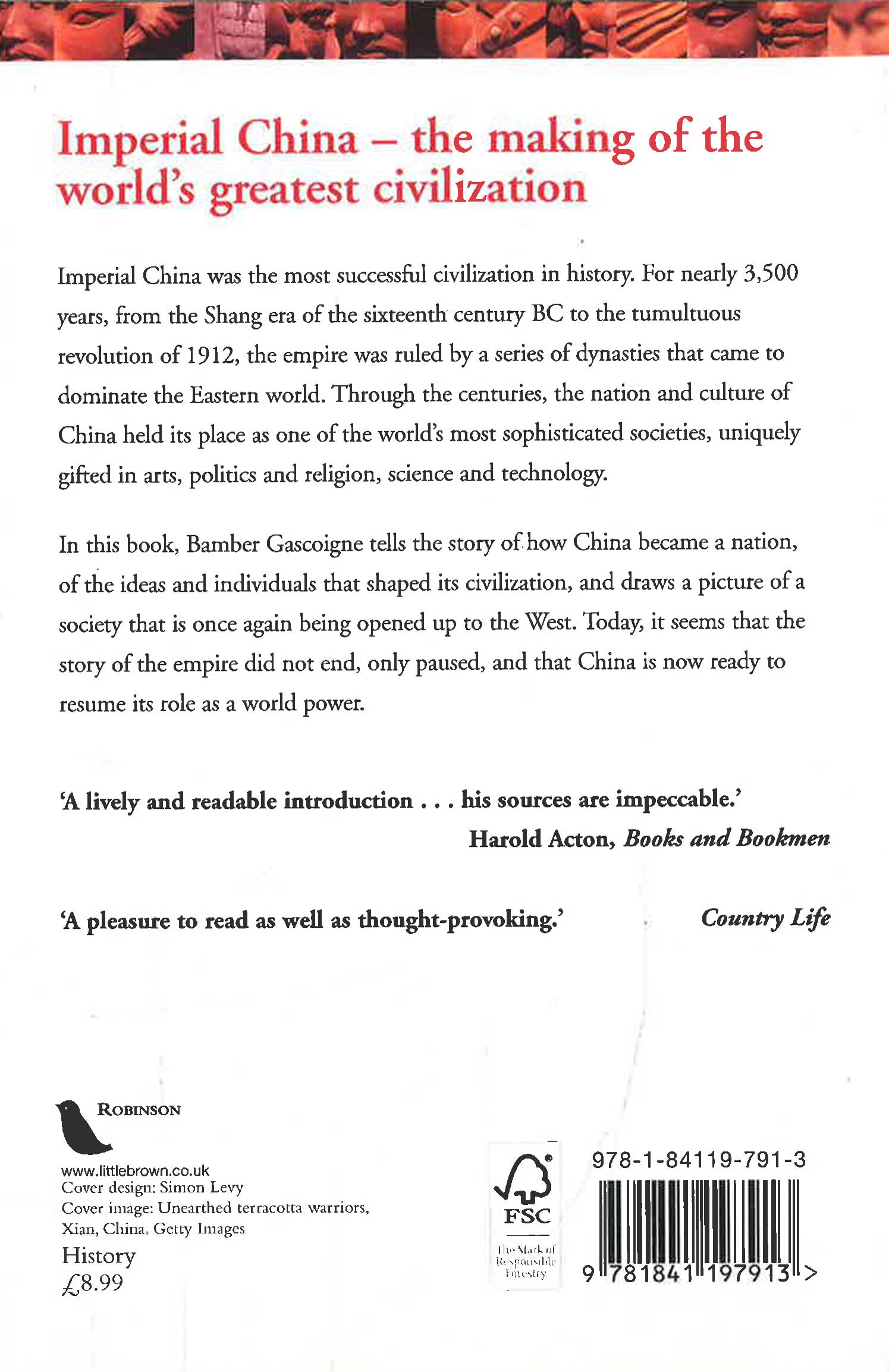Although China's great empire lasted for longer than any other, no country has suffered so great an imbalance between the fame of its art and obscurity of its history. The names of the great dynasties are familiar, yet who can actually locate a T'ang horse or a Ming vase in its social or cultural context? By focusing on the key colourful characters of the eight major dynasties, Bamber Gascoigne brings to life 3500 years of Chinese civilization. His bird's-eye view starts on the borders of myth. It moves swiftly on to the greatest achievements of language and thought, the cultural treasures and imperial palaces, wars won and lands lost to the Mongols, finally to arrive at the 1912 Revolution, which contained within it the seeds of Communism that ensured the overthrow of the last emperor. Via this portrait of an empire and its peoples he has opened the door to a world for too long inaccessible to the West.