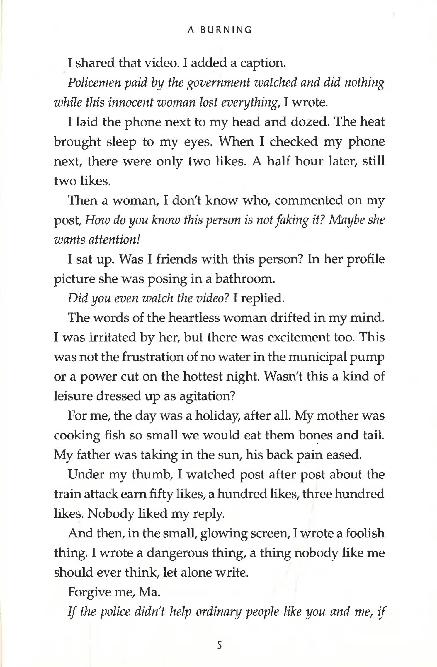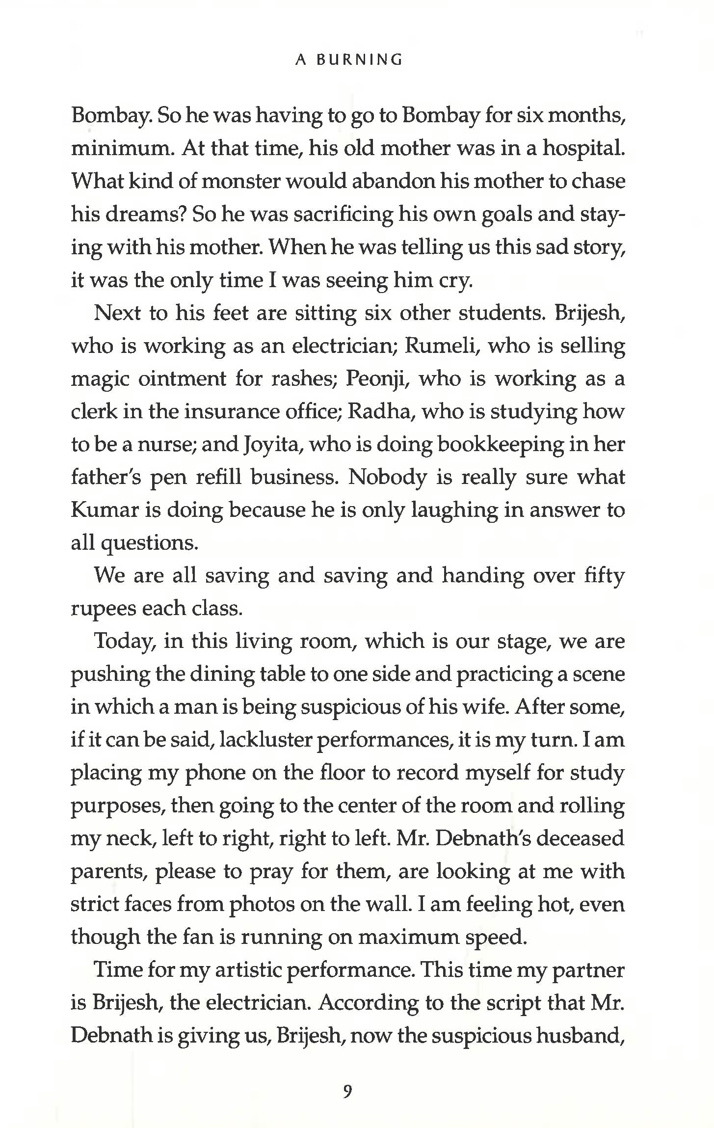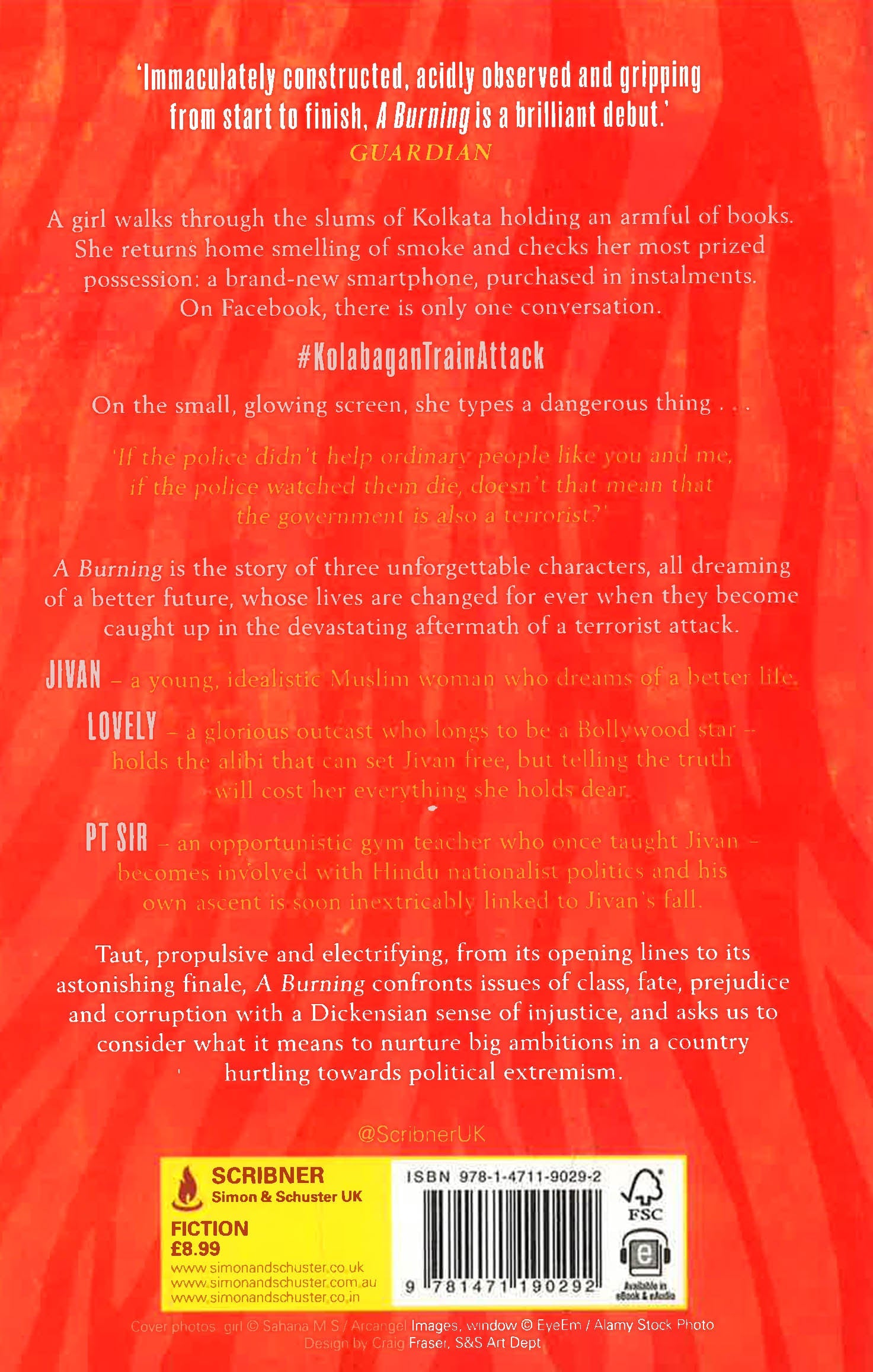 Set in contemporary India, A Burning is the story of three unforgettable characters, all dreaming of a better future, whose lives are changed for ever when they become caught up in the devastating aftermath of a terrorist attack.