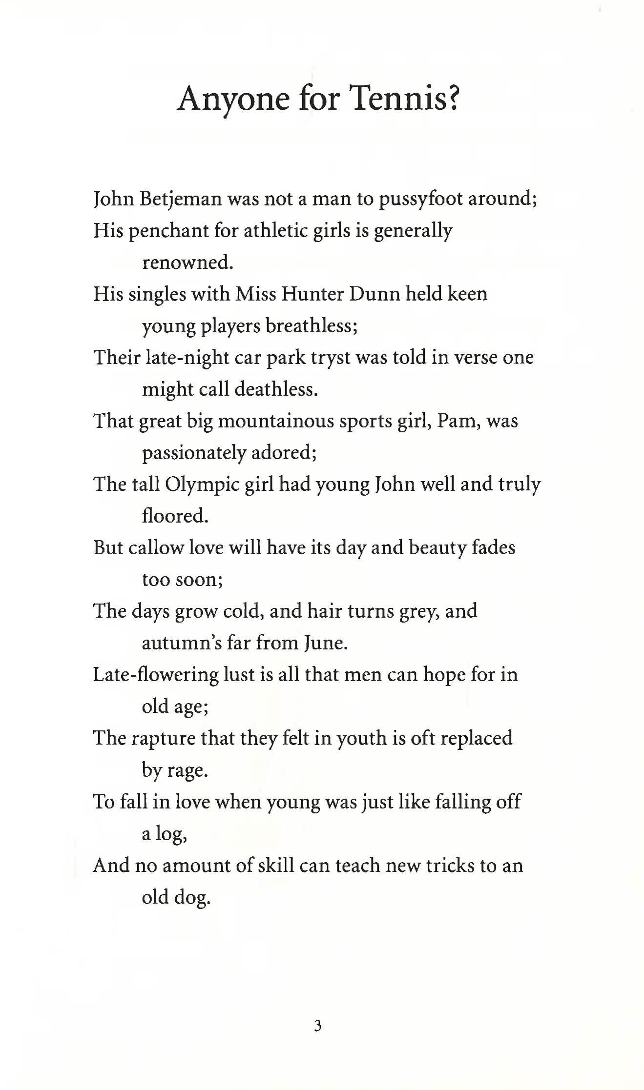 Christopher Matthew's latest collection of canny comic verse negotiates the perils and pitfalls of romance in later years. Love is revealed in the most unlikely places, with the most improbable people seeking it. Whether in Dorking, Diss, Clapham Junction or West Wittering, there are amorous opportunities waiting to be seized at the bridge table, on the tennis court, in the herbaceous border, on a bicycle made for two, or simply in warm companionship.