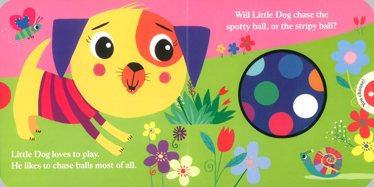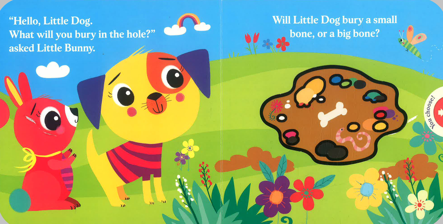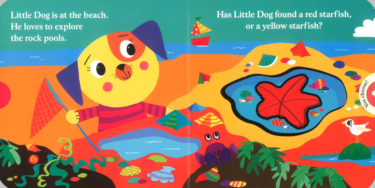 Help Little Dog on his busy day in this choose-the-story book, where pictures magically change as you push and pull the tabs to decide what happens next.Join in with Little Dog's story and choose what happens on each page by pulling the tab and watching each acetate picture transform to change the colour or reveal hidden surprises. Choose if Little Dog will bury a big or a little bone, which ball he will play with, what Little Dog sees at the beach and more.This is a fun novelty story book that's full of imaginative reading fun, with simple words and questions to encourage interactive play. The chunky pages are perfect for little hands to turn, and the five card tabs can be pulled out and pushed back easily to change each picture.
