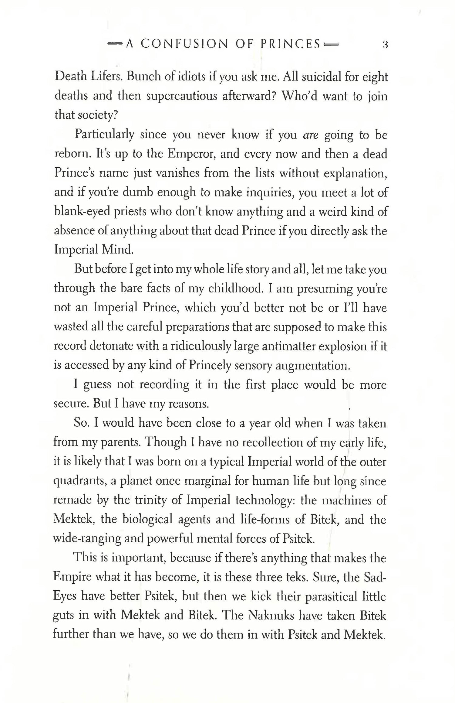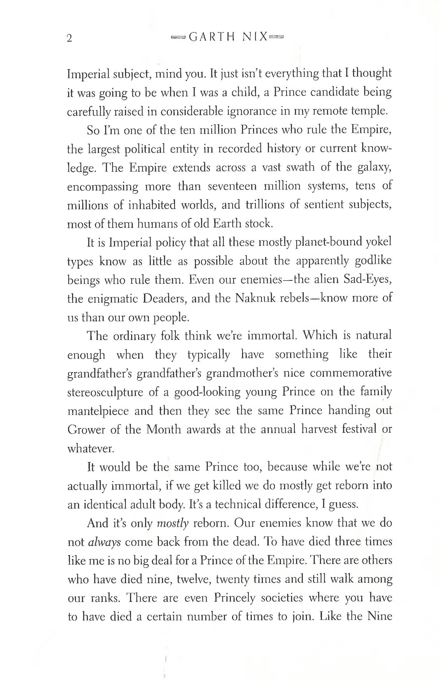You'd think being a Prince in a vast intergalactic empire would be about as good as it gets. Particularly when Princes are faster, smarter, and stronger than normal humans. Not to mention being mostly immortal. But it isn't as great as it sounds. Princes need to be hard to kill - as Khemri learns the minute he becomes one - for they are always in danger. Their greatest threat? Other Princes. Every Prince wants to become Emperor, and the surest way to do so is to kill, dishonor, or sideline any potential competitor. There are rules, but as Khemri discovers, rules can be bent and even broken. Soon Khemri is drawn into the hidden workings of the Empire and dispatched on a secret mission. In the ruins of space battle he meets a young woman called Raine, who challenges his view of the Empire, of Princes, and of himself. But Khemri is a Prince, and even if he wanted to leave the Empire behind, there are forces that have very definite plans for his future. . . .