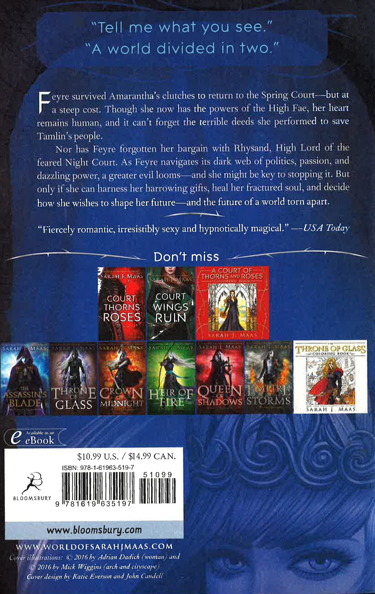 Tell me what you see. "A world divided in two. Feyre survived Amarantha's clutches to return to the Spring Court-but at a steep cost. Though she now has the powers of the High Fae, her heart remains human, and it can't forget the terrible deeds she performed to save Tamlin's people. Nor has Feyre forgotten her bargain with Rhysand, High Lord of the feared Night Court. As Feyre navigates its dark web of politics, passion, and dazzling power, a greater evil looms-and she might be key to stopping it. But only if she can harness her harrowing gifts, heal her fractured soul, and decide how she wishes to shape her future-and the future of a world torn apart.