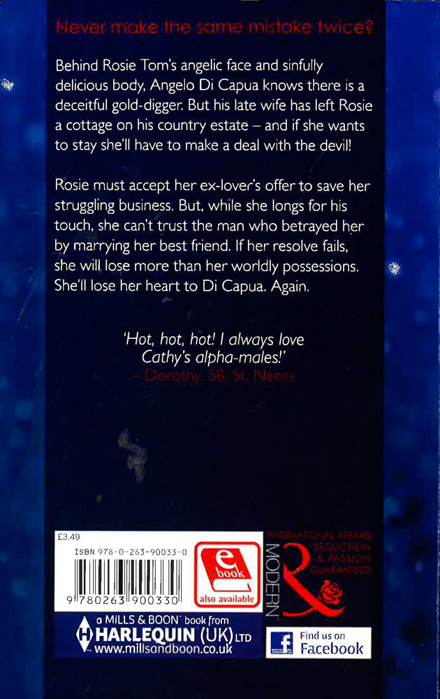 Never make the same mistake twice? Behind Rosie Tom's angelic face and sinfully delicious body, Angelo Di Capua knows there is a deceitful gold-digger. But his late wife has left Rosie a cottage on his country estate - and if she wants to stay she'll have to make a deal with the devil! Rosie must accept her ex-lover's offer to save her struggling business. But, while she longs for his touch, she can't trust the man who betrayed her by marrying her best friend. If her resolve fails, she will lose more than her worldly possessions. She'll lose her heart to Di Capua. Again. "Hot, hot, hot! I always love Cathy's alpha-males!' - Dorothy, 58, St. Neots www.caitlincrews.com