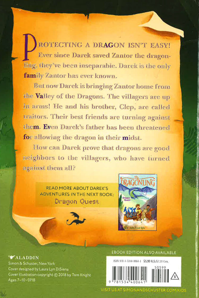 Darek and Zantor work to convince everyone that dragons and humans can get along in this second book in the fantastical Dragonling chapter book series!Ever since Darek saved Zantor the dragonling, they've been inseparable. Darek is the only family Zantor has ever known. But now Darek is bringing Zantor home from the Valley of the Dragons, and the villagers are up in arms! He and his brother Clep are called traitors. Their best friends are turning against them. Even Darek's father has been threatened for allowing the enemy in their midst. How can Darek prove that dragons are good neighbors to the villagers?