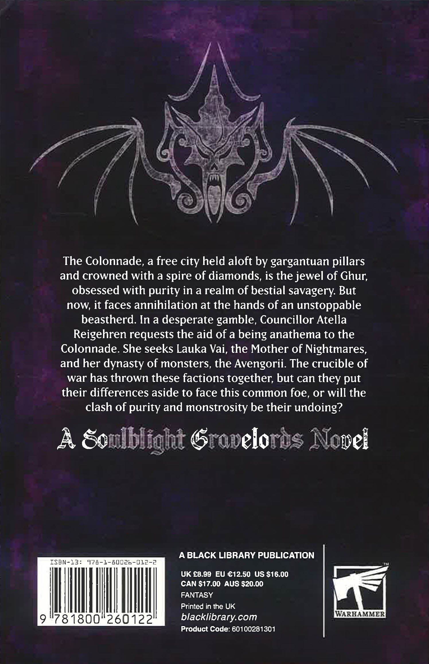 The Colonnade, a free city held aloft by gargantuan pillars and crowned with a spire of diamonds, is the jewel of Ghur, obsessed with purity in a realm of bestial savagery. But now, it faces annihilation at the hands of an unstoppable beastherd. In a desperate gamble, Councillor Atella Reigehren requests the aid of a being anathema to the Colonnade. She seeks Lauka Vai, the Mother of Nightmares, and her dynasty of monsters, the Avengorii. The crucible of war has thrown these factions together, but can they put their differences aside to face this common foe, or will the clash of purity and monstrosity be their undoing?