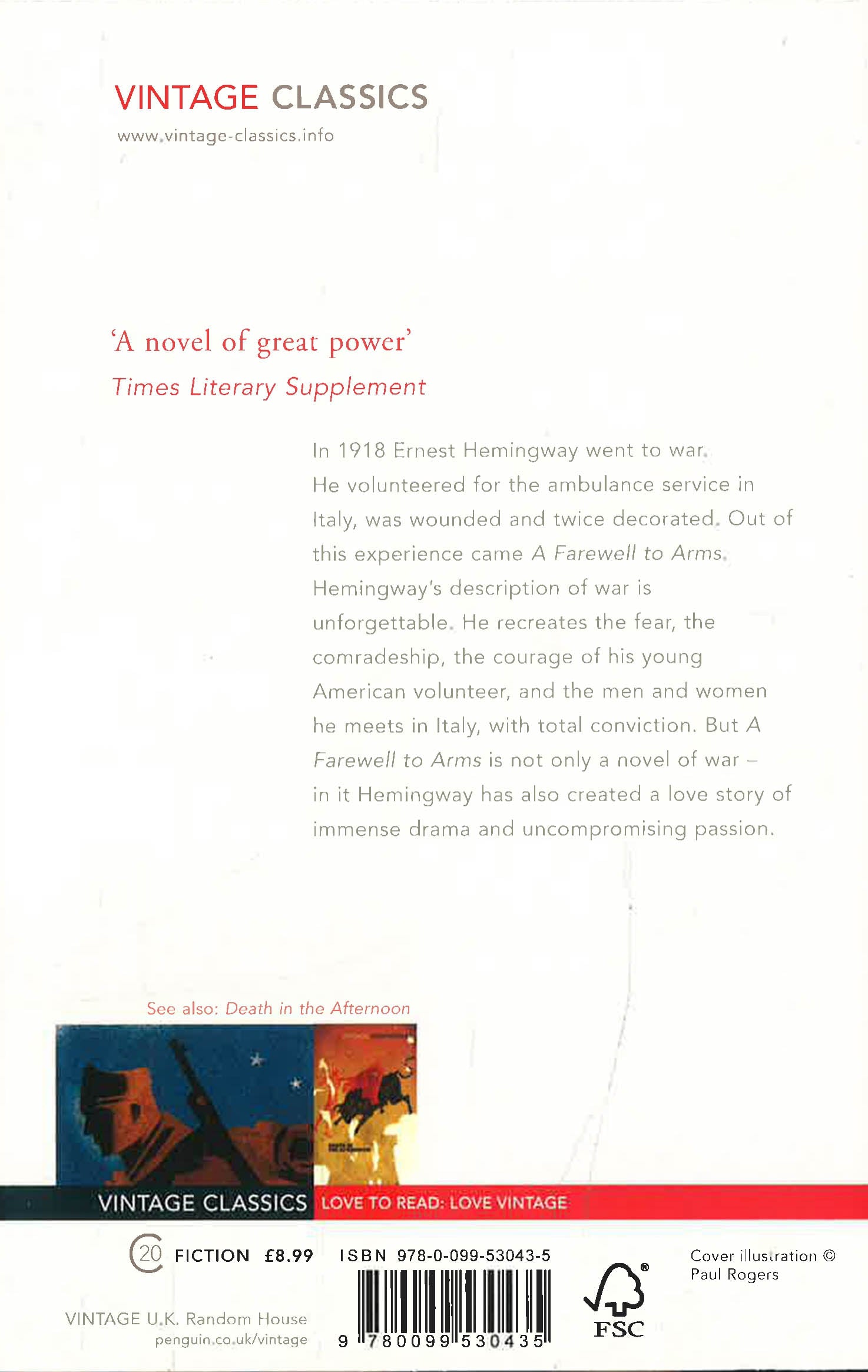 In 1918 Ernest Hemingway went to war. He volunteered for ambulance service in Italy, was wounded and twice decorated. Out of his experience came A Farewell to Arms. Hemingway's unforgettable book recreates the fear, the courage and the comradeship of warfare with total conviction. But A Farewell to Arms is not only a novel of war, it is also a love story of immense drama and uncompromising passion.