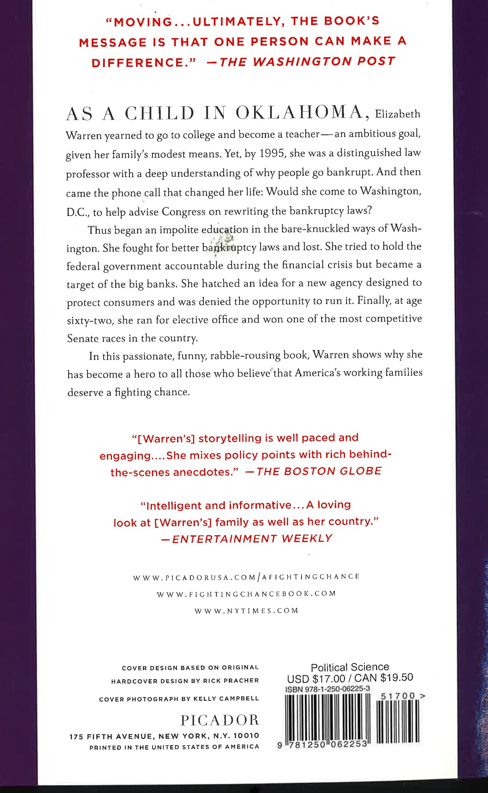 A NEW YORK TIMES BESTSELLER An unlikely political star tells the inspiring story of the two-decade journey that taught her how Washington really works--and really doesn't As a child in small-town Oklahoma, Elizabeth Warren yearned to go to college and then become an elementary school teacher--an ambitious goal, given her family's modest means. Early marriage and motherhood seemed to put even that dream out of reach, but fifteen years later she was a distinguished law professor with a deep understanding of why people go bankrupt. Then came the phone call that changed her life: could she come to Washington DC to help advise Congress on rewriting the bankruptcy laws? Thus began an impolite education into the bare-knuckled, often dysfunctional ways of Washington. She fought for better bankruptcy laws for ten years and lost. She tried to hold the federal government accountable during the financial crisis but became a target of the big banks. She came up with the idea for a new agency designed to protect consumers from predatory bankers and was denied the opportunity to run it. Finally, at age 62, she decided to run for elective office and won the most competitive--and watched--Senate race in the country. In this passionate, funny, rabble-rousing book, Warren shows why she has chosen to fight tooth and nail for the middle class--and why she has become a hero to all those who believe that America's government can and must do better for working families.
