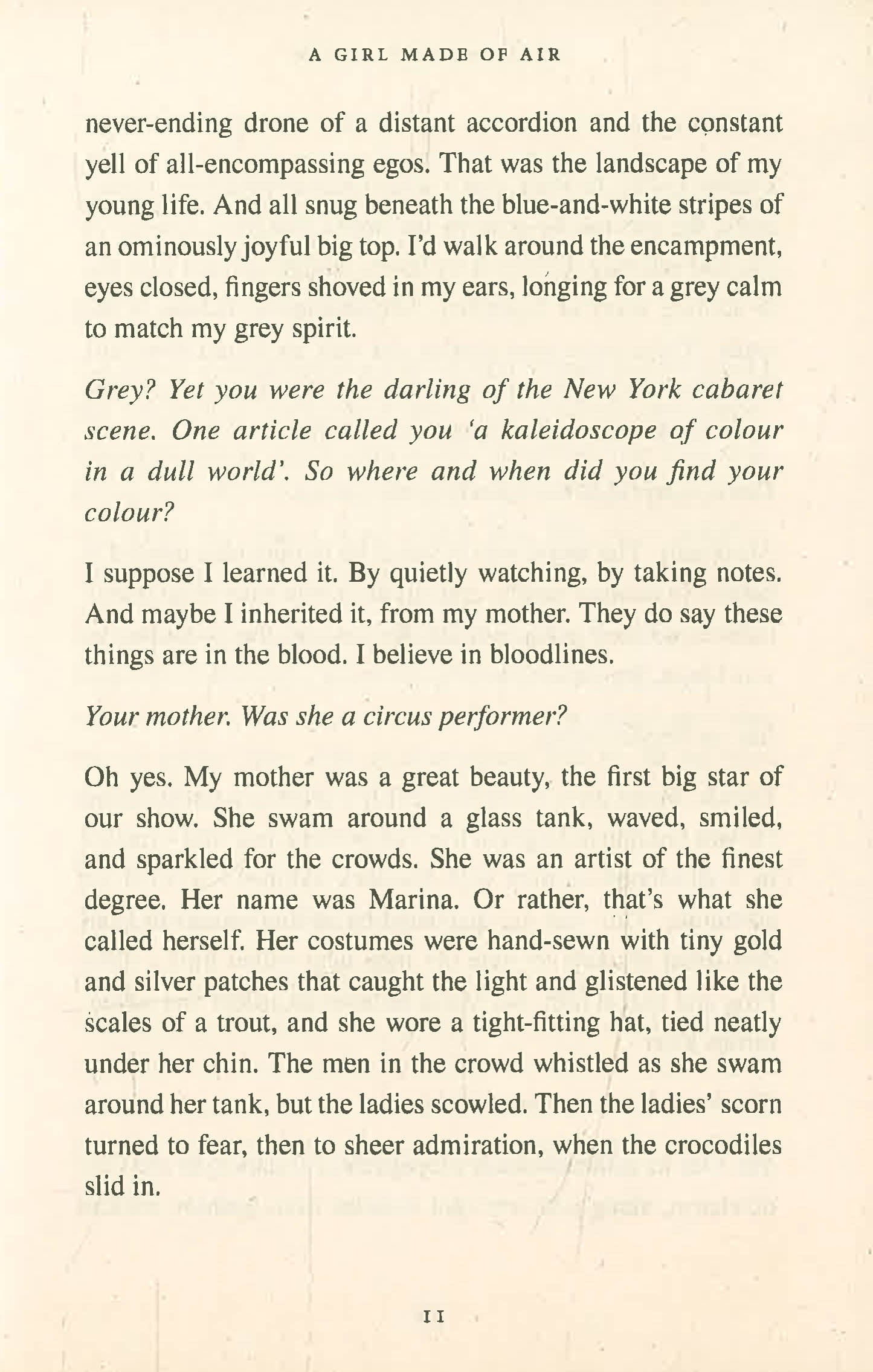 Beautiful and intoxicating, A Girl Made of Air brings the circus to life in all of its grime and glory; Marina, Manu, Serendipity Wilson, Fausto, Big Gen and Mouse will live long in the hearts of readers. As will this story of loss and reconciliation, of storytelling and truth.