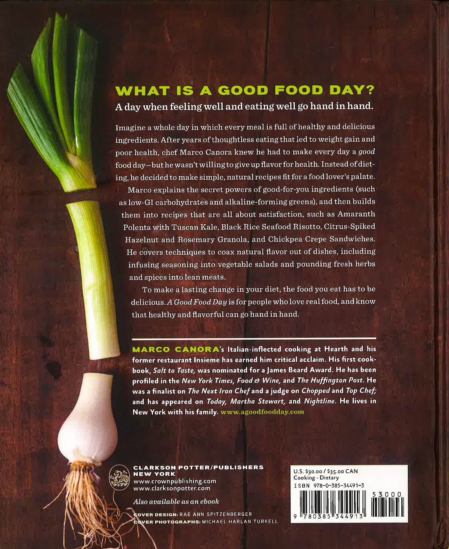 In "A Good Food Day", more than 100 recipes made with good-for-you ingredients make a good food day--a day when feeling good and eating well go hand in hand--easy and attainable. After years of thoughtless eating that led to weight gain and poor health, chef Marco Canora knew he had to make every day a good food day: a whole day in which every meal was full of healthy and delicious ingredients. But he wasn't willing to give up flavor for health. Instead of dieting, he decided to make simple, natural recipes fit for a food lover's palate. Marco explains the secret powers of good-for-you ingredients such as, low-GI carbohydrates and alkaline-forming greens, and then builds them into recipes that are all about satisfaction, such as Amaranth Polenta with Tuscan Kale, Black Rice Seafood Risotto, Citrus-Spiked Hazelnut and Rosemary Granola, and Chickpea Crepe Sandwiches. He covers techniques to coax natural flavor out of dishes, including infusing seasoning into vegetable salads and pounding fresh herbs and spices into lean meats. To make a lasting change in your diet, the food you eat has to be delicious. A Good Food Day is for people who love real food, and know that healthy and flavorful can go hand in hand.