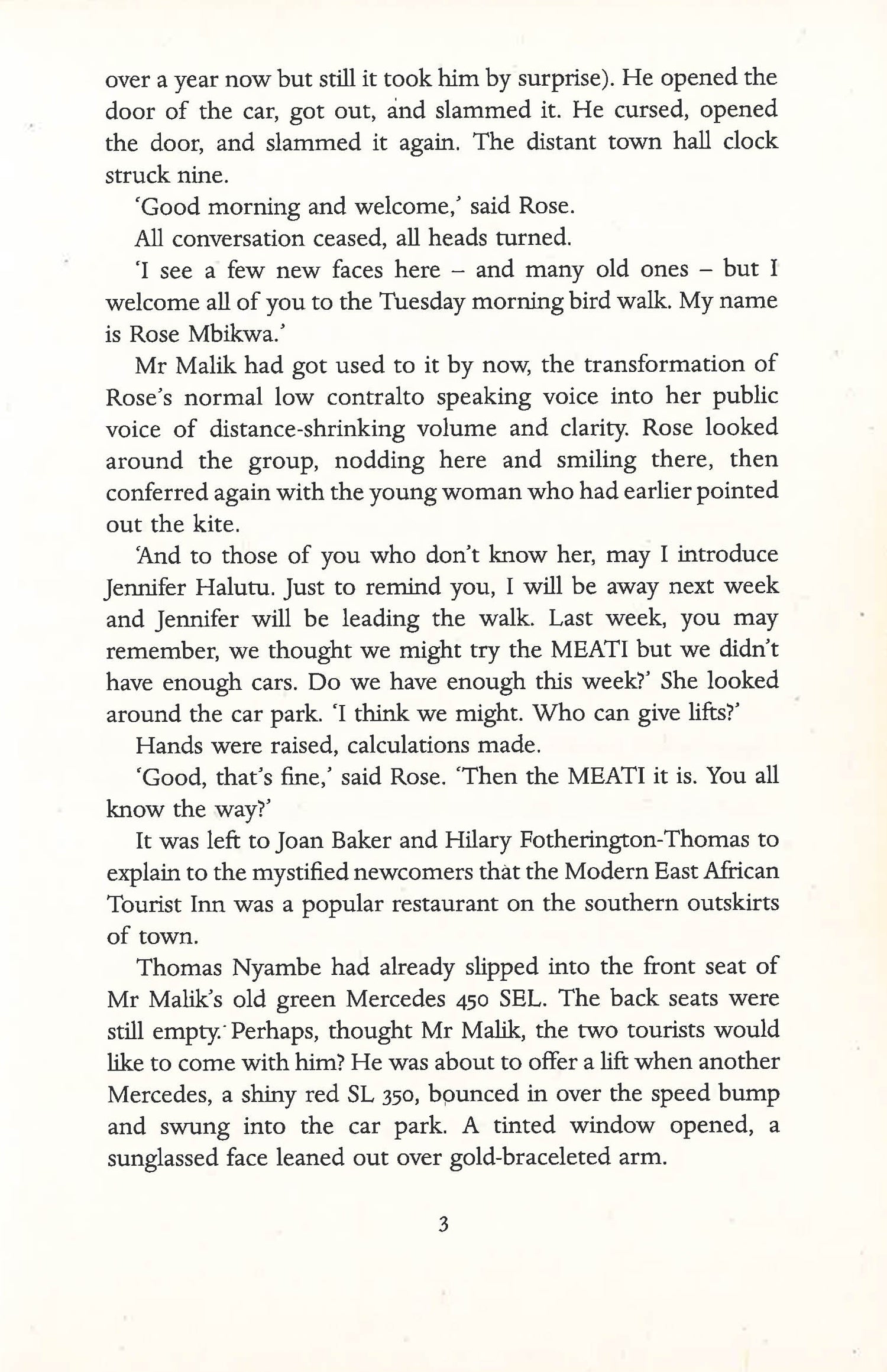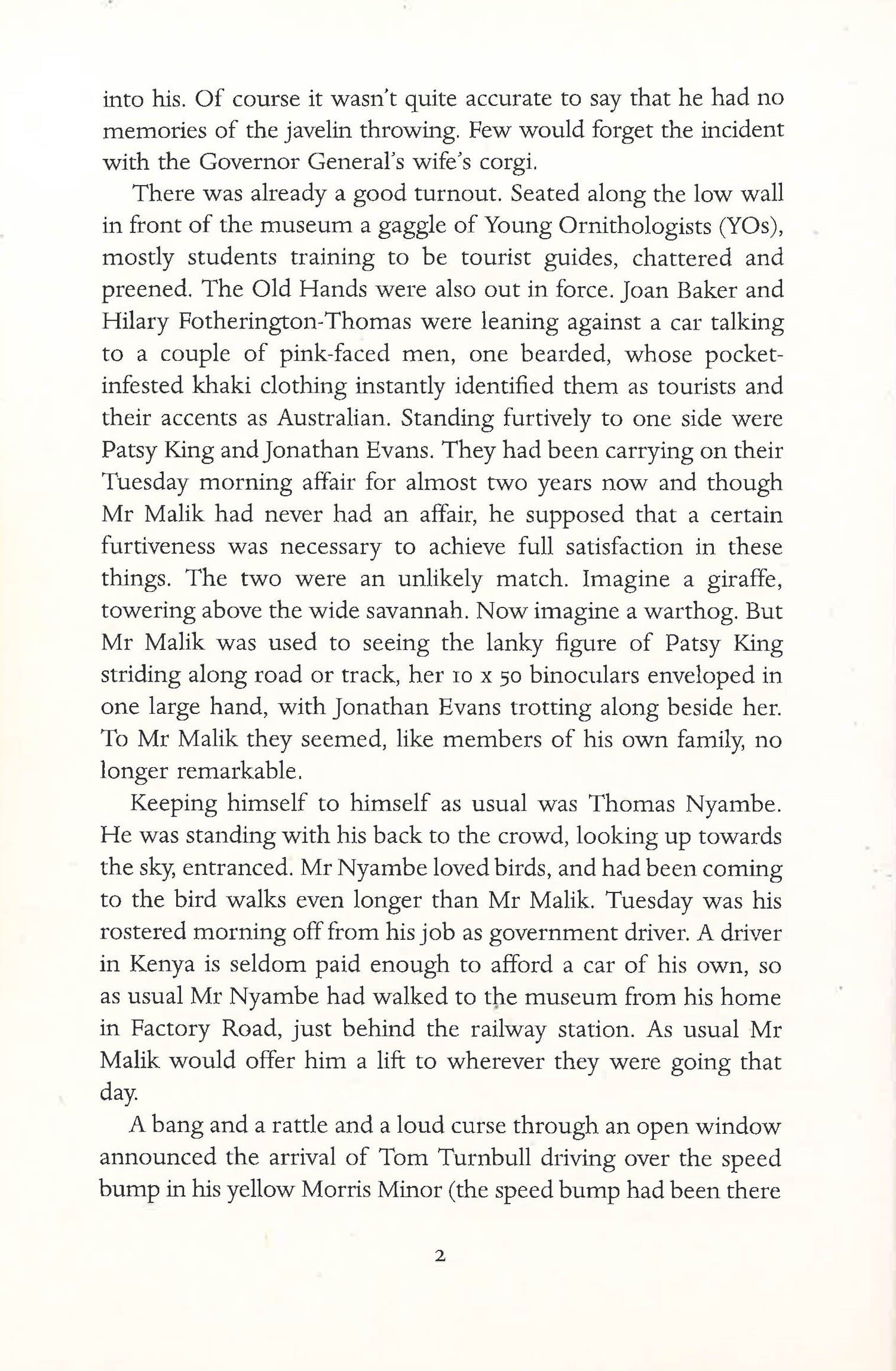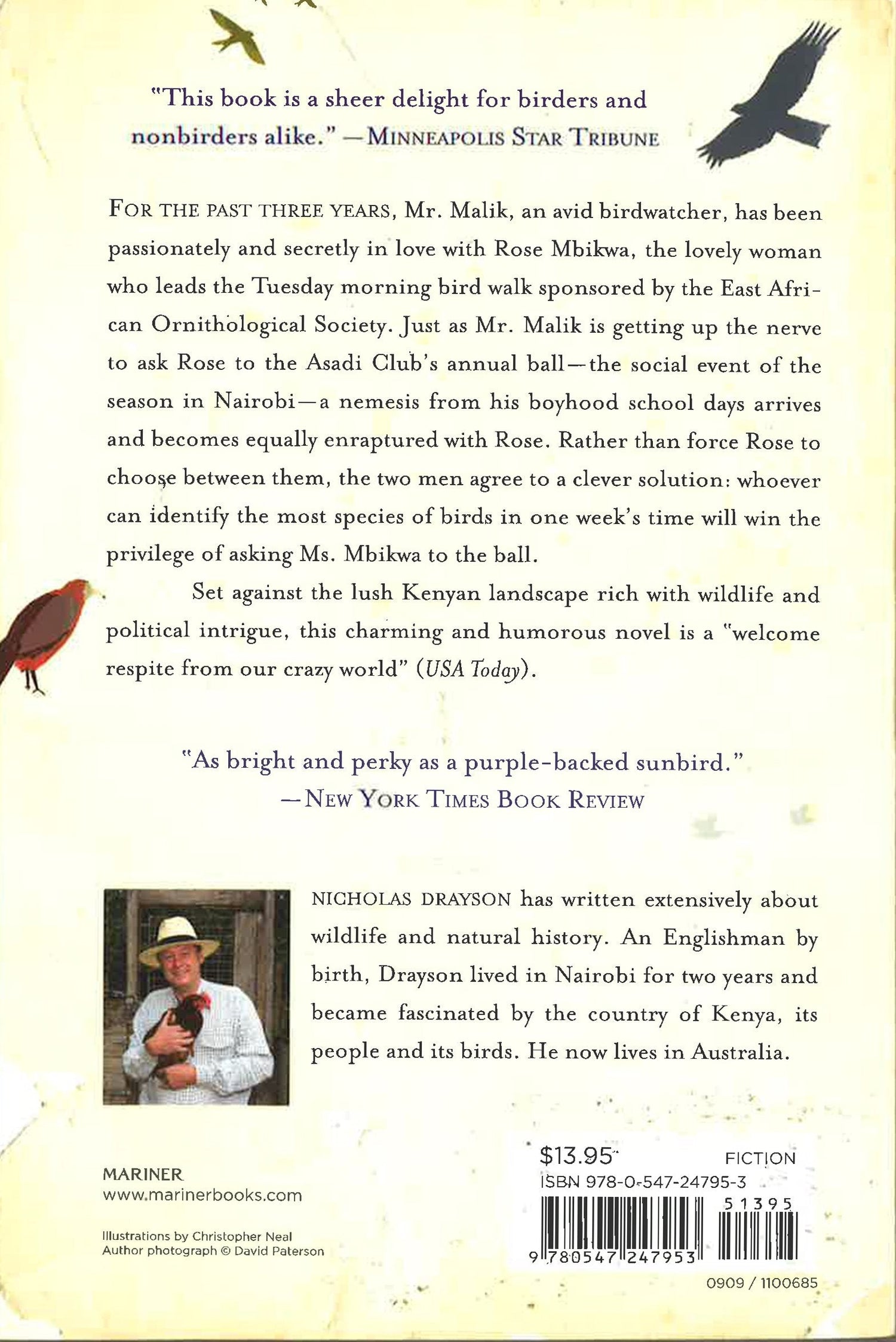 A beguiling novel that does for contemporary Kenya and its 1,000 species of birds what Alexander McCall Smiths Ladies Detective series does for Botswana For the past three years, the widower Mr. Malik has been secretly in love with Rose Mbikwa, a woman who leads the weekly bird walks sponsored by the East African Ornithological Society. Reserved and honorable, Malik wouldn't be noticed by a bystander in a Nairobi streetexcept perhaps to comment on his carefully sculpted combover. But beneath that unprepossessing exterior lies a warm heart and a secret passion. But just as Malik is getting up the nerve to invite Rose to the Nairobi Hunt Club Ball (the premier social occasion of the Kenyan calendar), who should pop up but his nemesis from his school days. The jokester Harry Khan, good-looking in a flashy way and quick of foot, has also become enraptured with the object of Maliks affection. So begins the competition cooked up by fellow members of the Asadi club: whoever can identify the most species of birds in one weeks time gets the privilege of asking Ms. Mbikwa to the ball. Set against the lush Kenyan landscape rich with wildlife and political intrigue, this irresistible novel has been sold in eight countries and is winning fans worldwide.