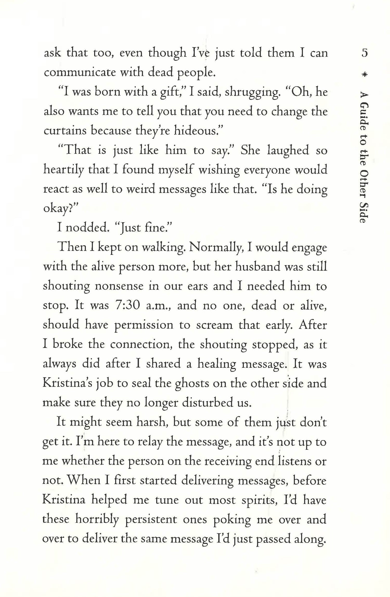 A boy and his ghostly twin sister work together to pass messages from the beyond in this funny paranormal debut. There are a few things you should know about Baylor Bosco: Hes thirteen-years-old, he has a twin sister, and he really does NOT like ghosts…which is problematic because hes a medium and sees ghosts everywhere. Oh, and his twin sister, Kristina? Shes a ghost too. Theyve been working as a pair for years, expertly relaying messages from ghosts to their still-living loved ones. Baylors even managed to come up with an introductory phraseone that he has to use far too often. But when a strange ghost shows up close to Halloween, a grown man, covered in a sheet, with only his black leather shoes showing from the bottom, Baylor starts to wonder if something else has taken notice of him. And when his sister goes missing, somehow ghost-napped, hes forced to figure out the truth about the Sheet Man and his sisters disappearance, all without his usual ghostly ambassador.