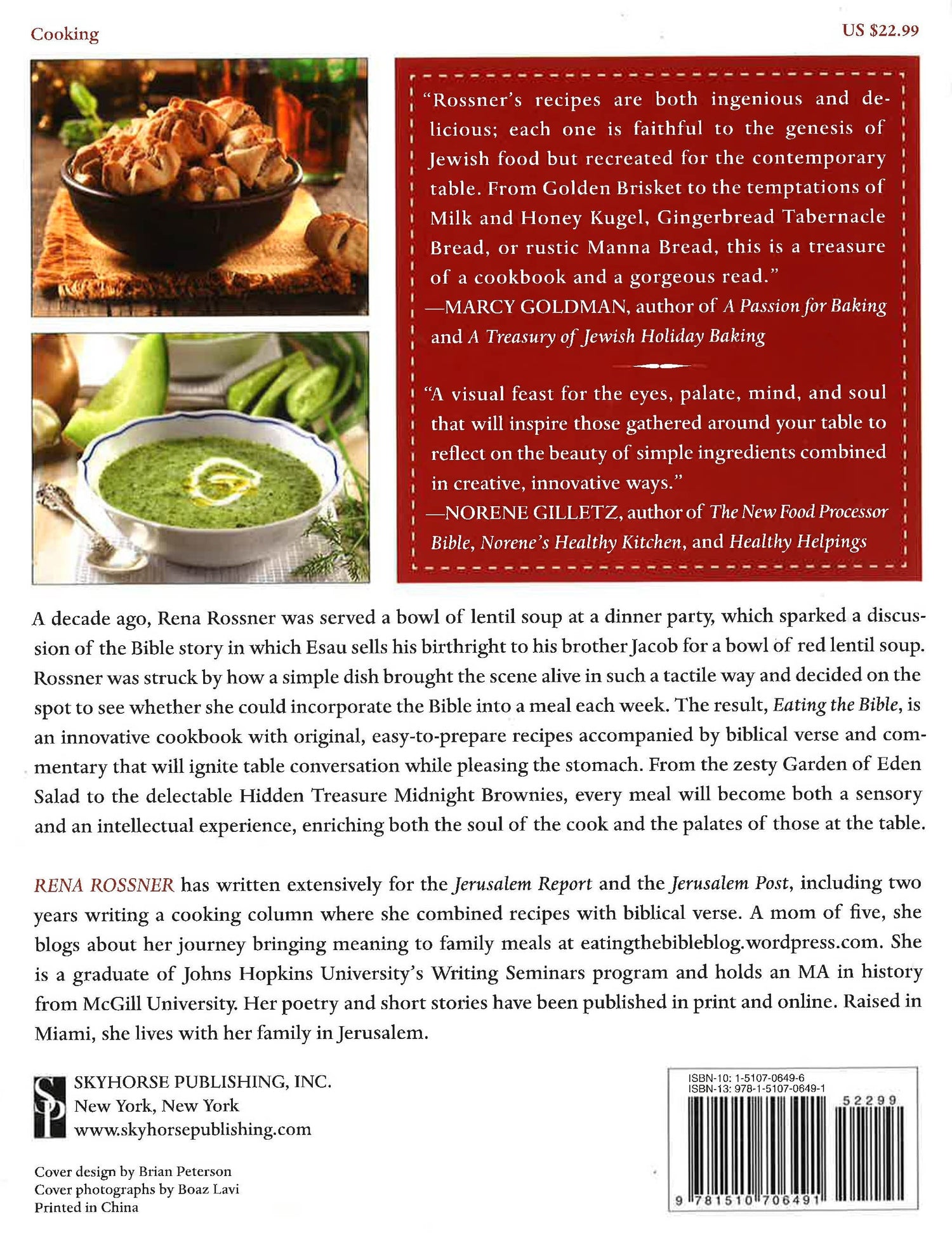 Eating the Bible is a new cookbook with recipes inspired by parts of the Bible. Author Rena Rossner was inspired to write it when one night, many years ago, someone served her a bowl of lentil soup. That week, she had heard the Bible story of Esau selling his birthright to his brother, Jacob, for a bowl of red lentil soup. Rossner wondered if she could bring others the connection to the Bible that she had felt through cooking. Every meal in Eating the Bible works towards that goal.