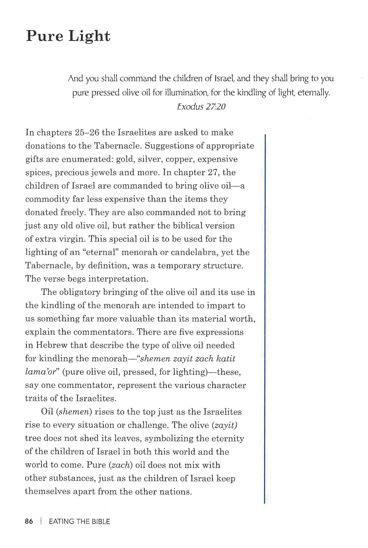 Whether you are a beginner cook or an expert, Eating the Bible is for you. Jewish Bible stories are shared throughout the guide, especially in moments where any cook has to wait. Rossner uses the time spent waiting for water to boil to share Bible stories or commentary to make cooking a contemplative experience. These recipes create a tactile connection between the Bible and food.
