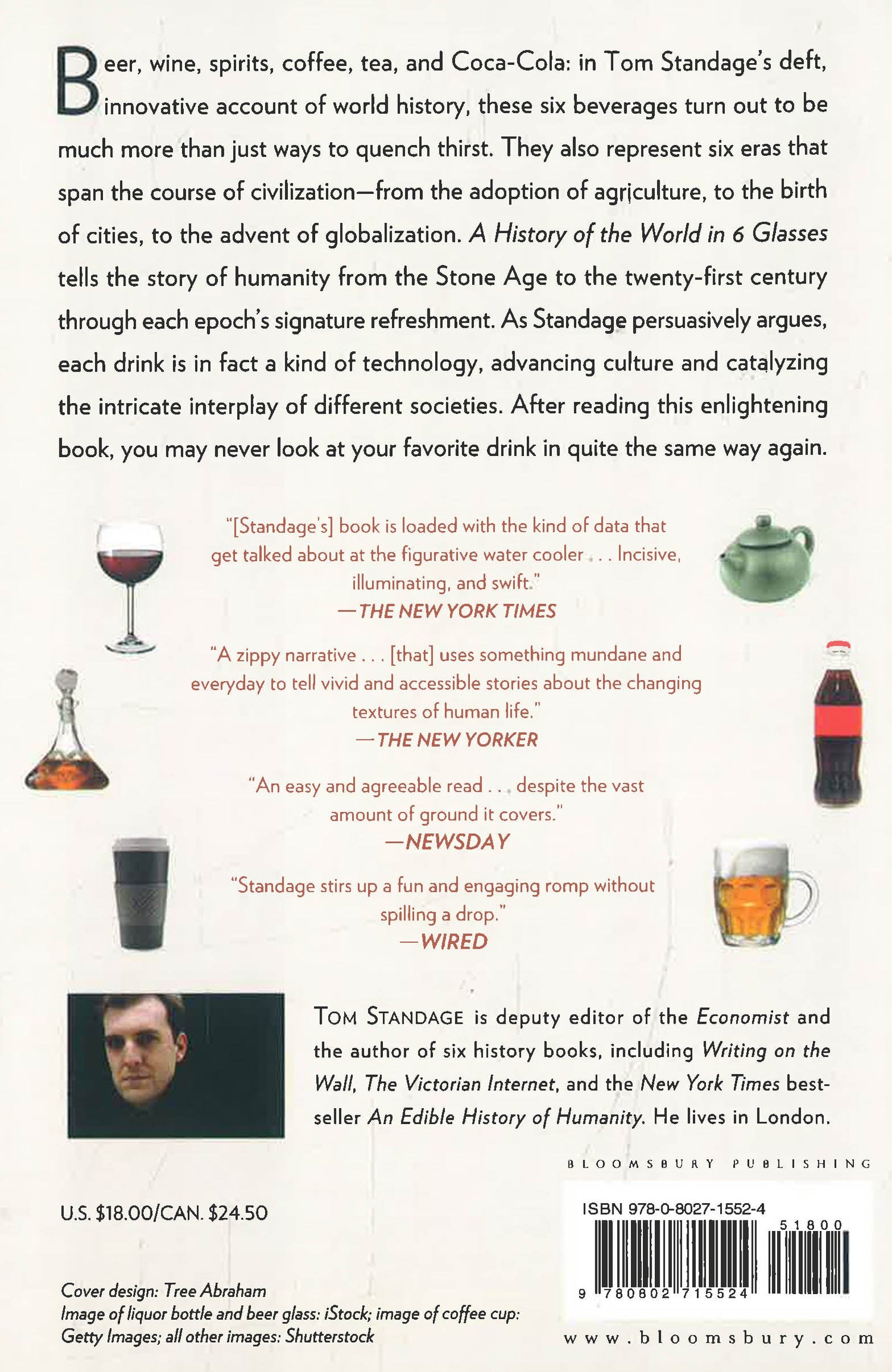 Beer, wine, spirits, coffee, tea, and Coca-Cola: In Tom Standage's deft, innovative account of world history, these six beverages turn out to be much more than just ways to quench thirst. They also represent six eras that span the course of civilization--from the adoption of agriculture, to the birth of cities, to the advent of globalization. A History of the World in 6 Glasses tells the story of humanity from the Stone Age to the twenty-first century through each epoch's signature refreshment. As Standage persuasively argues, each drink is in fact a kind of technology, advancing culture and catalyzing the intricate interplay of different societies. After reading this enlightening book, you may never look at your favorite drink in quite the same way again.