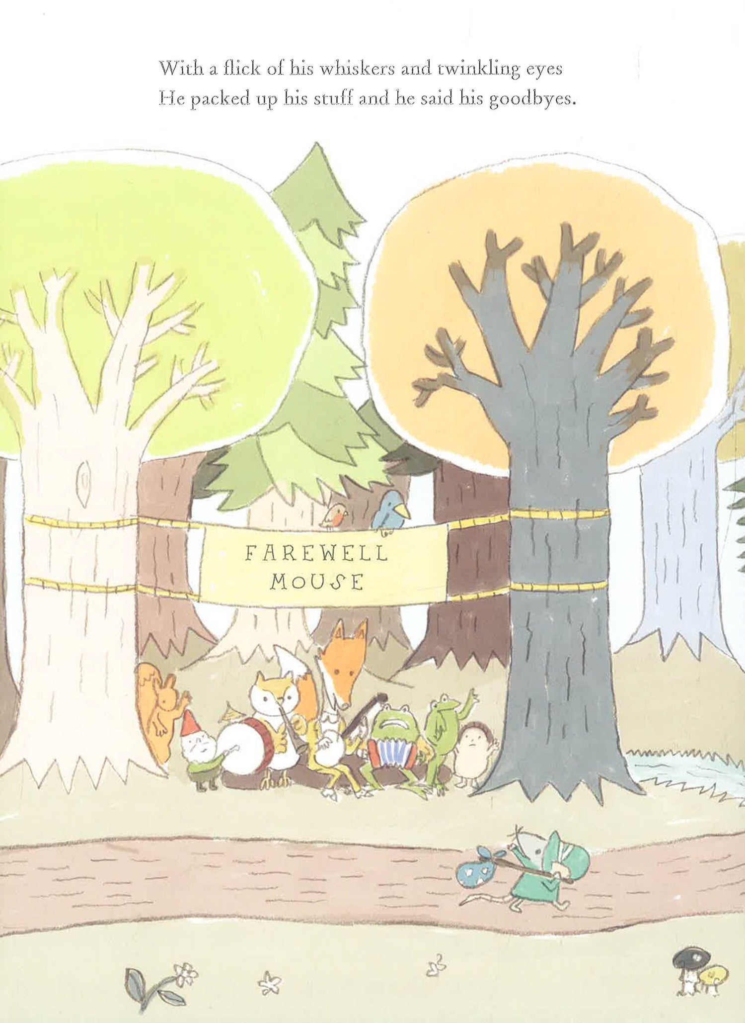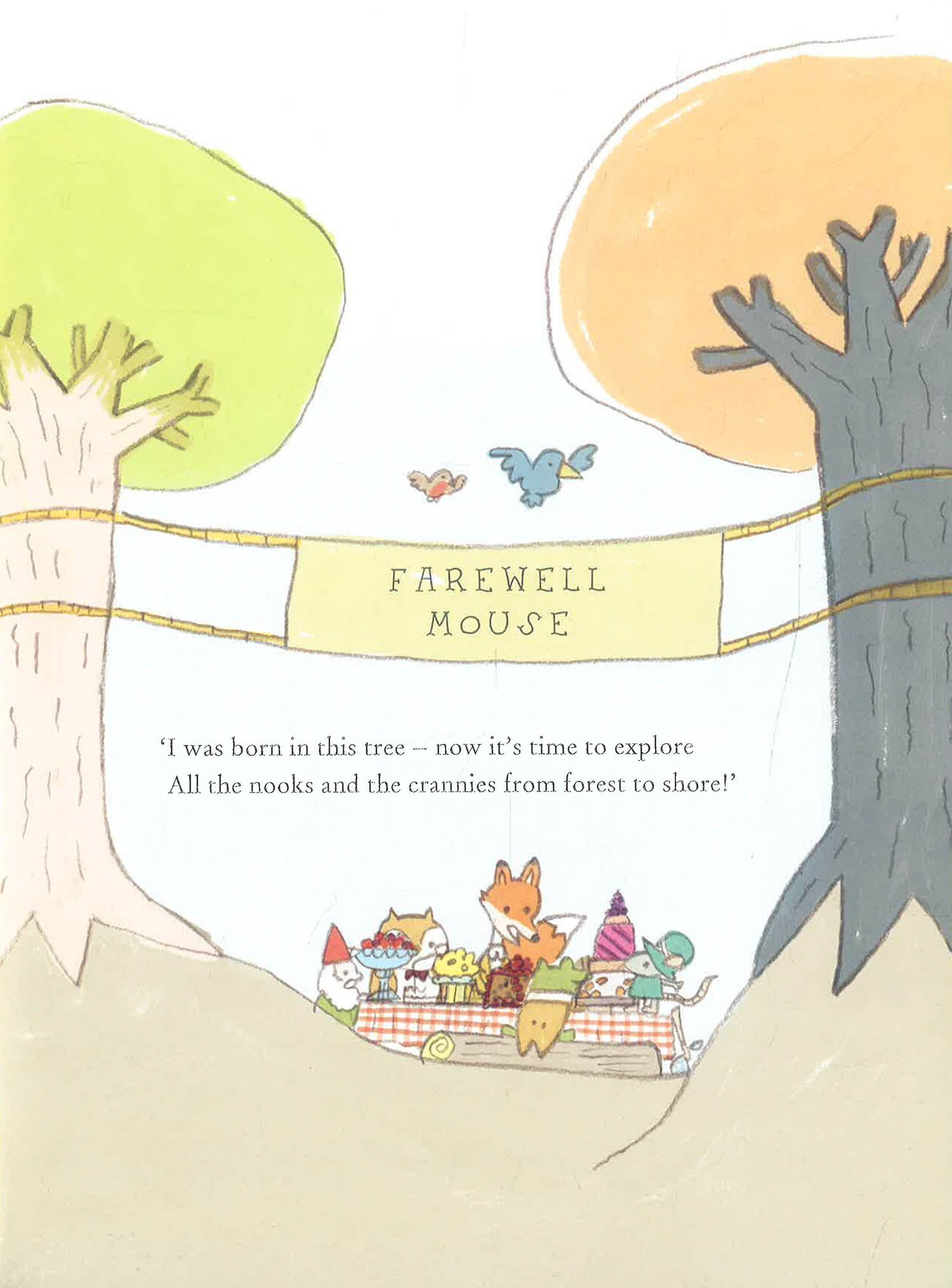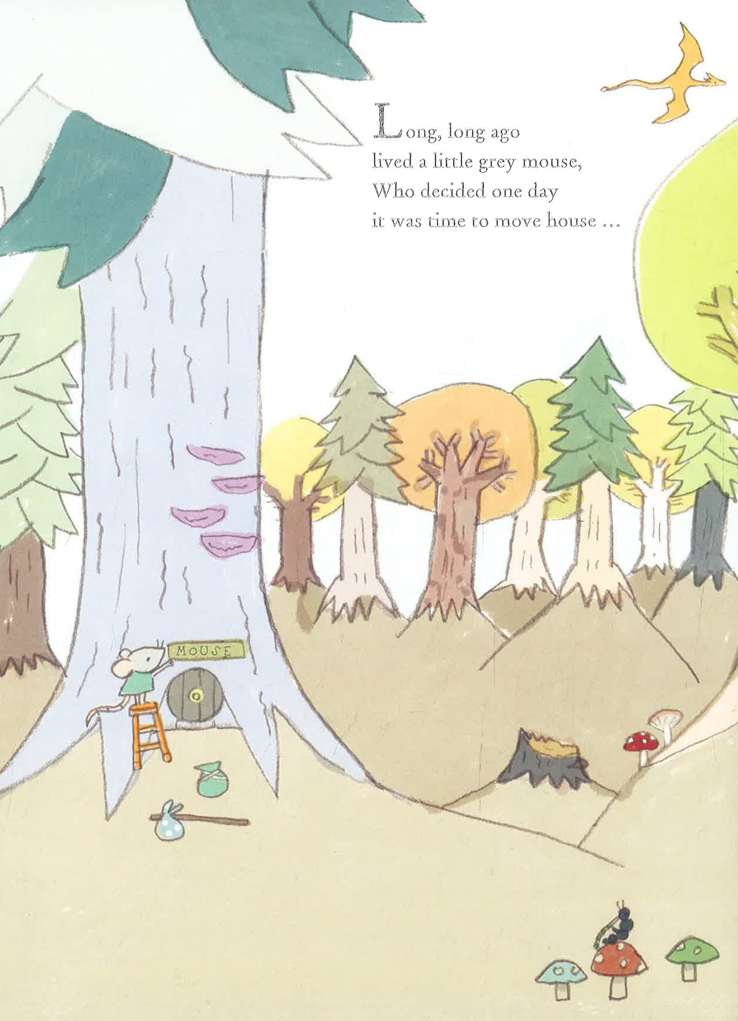 A House for Mouse tells the story of a little grey mouse who leaves his tiny hole in the forest to explore the wider world. On his search for a new home he unwittingly encounters some of the biggest stars in the fairytale genre. He discovers a house shaped like a shoe (belonging to Old Mother Hubbard); he takes tea with a little pig in a house made of straw (awfully breezy); is flummoxed by a tower with no door (Rapunzel's); and dares to take a nibble from a most remarkable house made of gingerbread (narrowly missing Hansel and Gretel). The little grey mouse is about to give up his search for a new home when he comes face to face with the most spectacular house of all: a glorious, towering castle (Sleeping Beauty's). Its ballrooms, turrets and drawbridge win him over, and he moves in immediately. But the little grey mouse feels terribly alone in his roomy new digs - until there is a knock at the door. His friends from the forest, and all those he has met on his journey, descend on the castle. Their feasting and dancing are so happy and lively that they even wake Sleeping Beauty, leading the little grey mouse to conclude that it is family and friends that turn a house into a home.