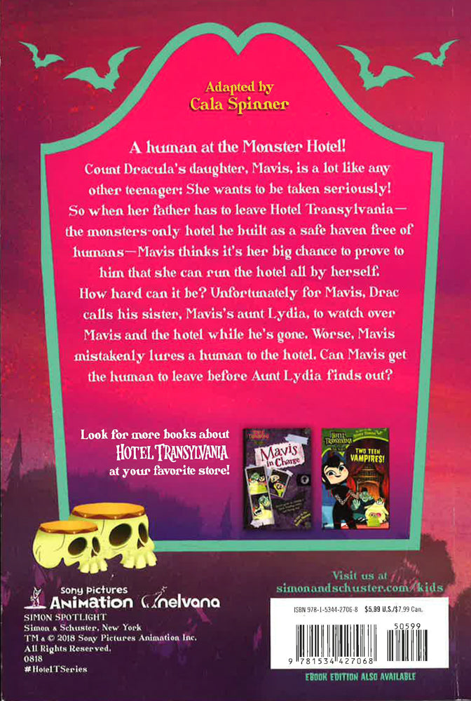 Count Dracula's daughter, Mavis, is a lot like any other teenager: She wants to be taken seriously! So when her father has to leave Hotel Transylvania-the monsters-only hotel he built as a safe haven free of humans-Mavis thinks it's her big chance to prove to him that she can run the hotel all by herself. How hard can it be? Unfortunately for Mavis, Drac calls his sister, Mavis's Aunt Lydia, to watch over Mavis and the hotel while he's gone. Worse, Mavis mistakenly lures a human to the hotel. Can Mavis get the human to leave before Aunt Lydia finds out?