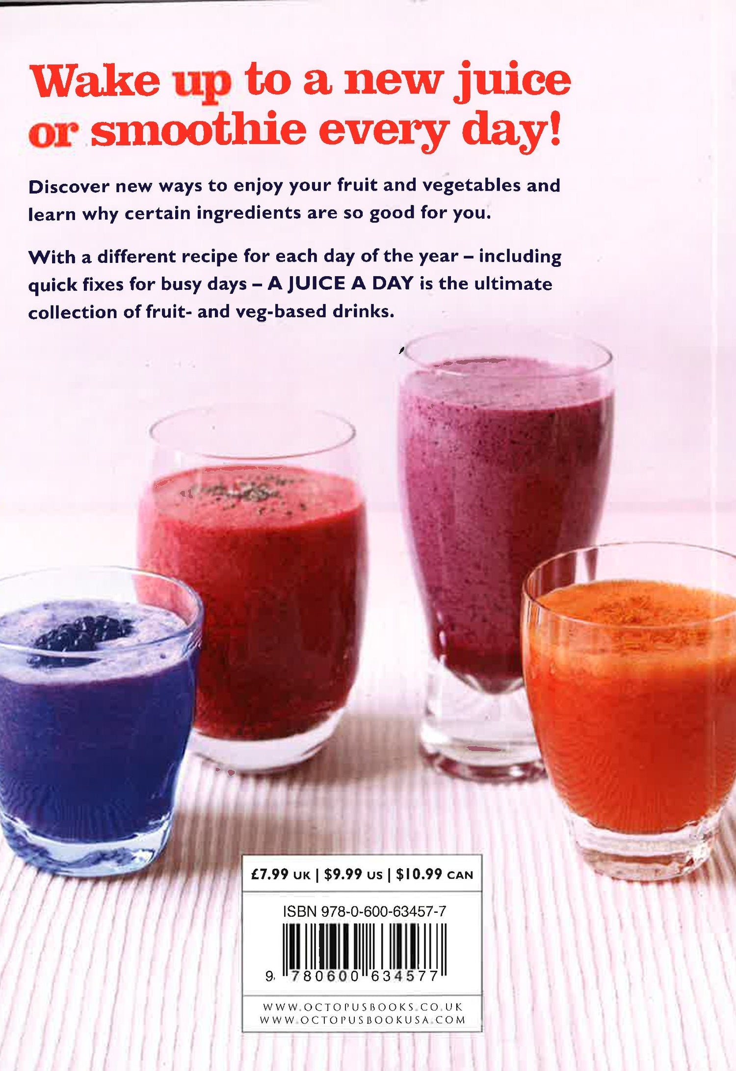 Wake up to a new juice or smoothie every day of the year! Discover new ways to enjoy your fruit and vegetables and learn why certain ingredients are so good for you. With a different recipe for each day of the year - including quick fixes for busy days - A Juice A Day is the ultimate collection of fruit-and veg-based drinks.Juices include Nutty Banana, Nectarine and Basil, Beet and Blueberry, Kumquat and Pear and Chocolate Blackcurrent Indulgence.