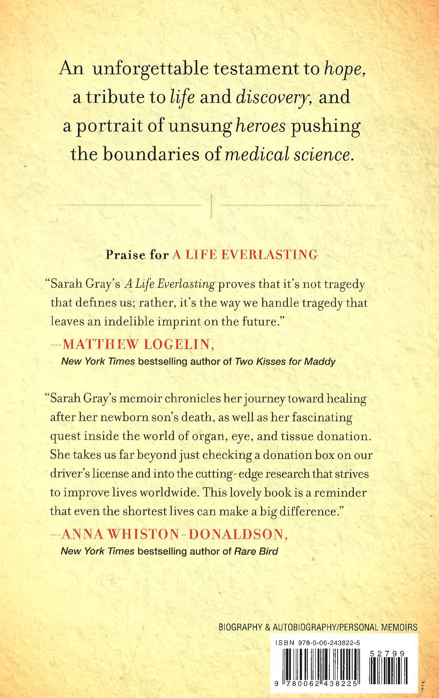 A donor mother’s powerful memoir of grief and rebirth that is also a fascinating medical science whodunit, taking us inside the world of organ, eye, tissue, and blood donation and cutting-edge scientific research.When Sarah Gray received the devastating news that her unborn son Thomas was diagnosed with anencephaly, a terminal condition, she decided she wanted his death - and life - to have meaning. In the weeks before she gave birth to her twin sons in 2010, she arranged to donate Thomas’s organs. Due to his low birth weight, they would go to research rather than transplant. As transplant donors have the opportunity to meet recipients, Sarah wanted to know how Thomas's donation would be used.That curiosity fueled a scientific odyssey that leads Sarah to some of the most prestigious scientific facilities in the country, including Harvard, Duke, and the University of Pennsylvania. Pulling back the curtain of protocol and confidentiality, she introduces the researchers who received Thomas’s donations, held his liver in their hands, studied his cells under the microscope.Sarah’s journey to find solace and understanding takes her beyond her son’s donations - offering a breathtaking overview of the world of medical research and the valiant scientists on the horizon of discovery. She goes behind the scenes at organ procurement organizations, introducing skilled technicians for whom death means saving lives, empathetic counselors, and the brilliant minds who are finding surprising and inventive ways to treat and cure disease through these donations. She also shares the moving stories of other donor families.A Life Everlasting is an unforgettable testament to hope, a tribute to life and discovery, and a portrait of unsung heroes pushing the boundaries of medical science for the benefit of all humanity.