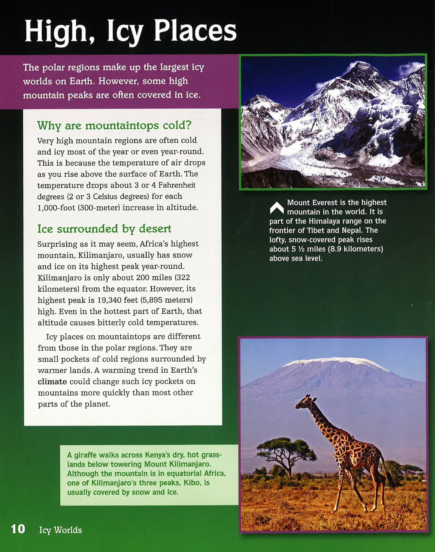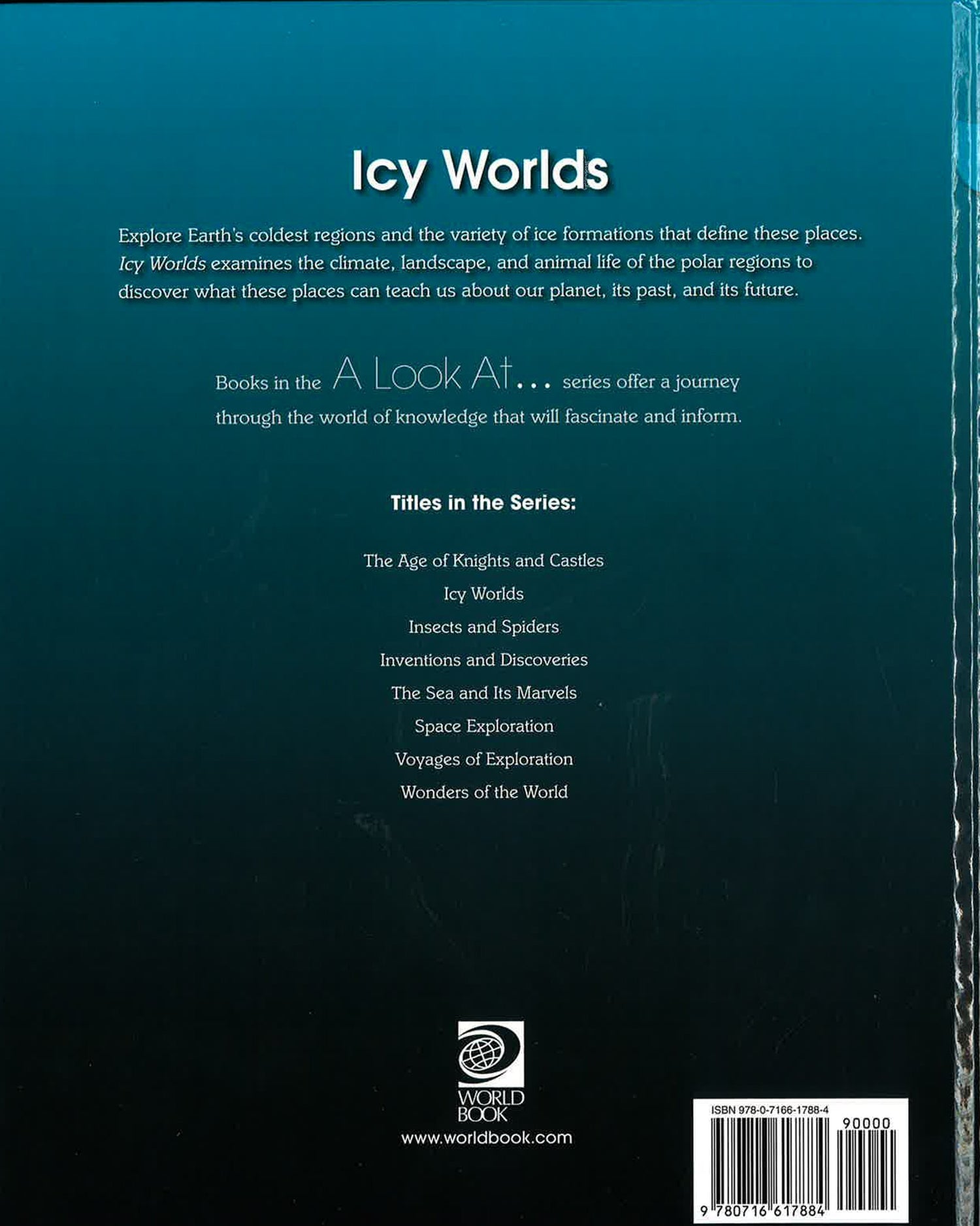 What animals live in the Arctic and Antarctica? What people live in the Arctic? What environmental threats are Earths polar regions facing? Explore Earths coldest regions and the variety of ice formations that define these places. Icy Worlds examines the climate, landscape, and animal life of Earths polar regions to help kids discover what these places can teach us about our planet, its past, and its future.With striking photographs and illustrations, World Books A Look At series takes children on a journey through different ages and locations around the globe and beyond. Perfect for visual learners, each nonfiction book creatively explores high-interest topics with ample illustrations and concise text that help readers absorb and retain information. Helpful glossaries and indexes in each volume direct students to the most important terms and topics. Help learners with a primary reading level of 6th to 8th grade encounter a range of topics in nature, history, science, and technology with World Books A Look At series!
