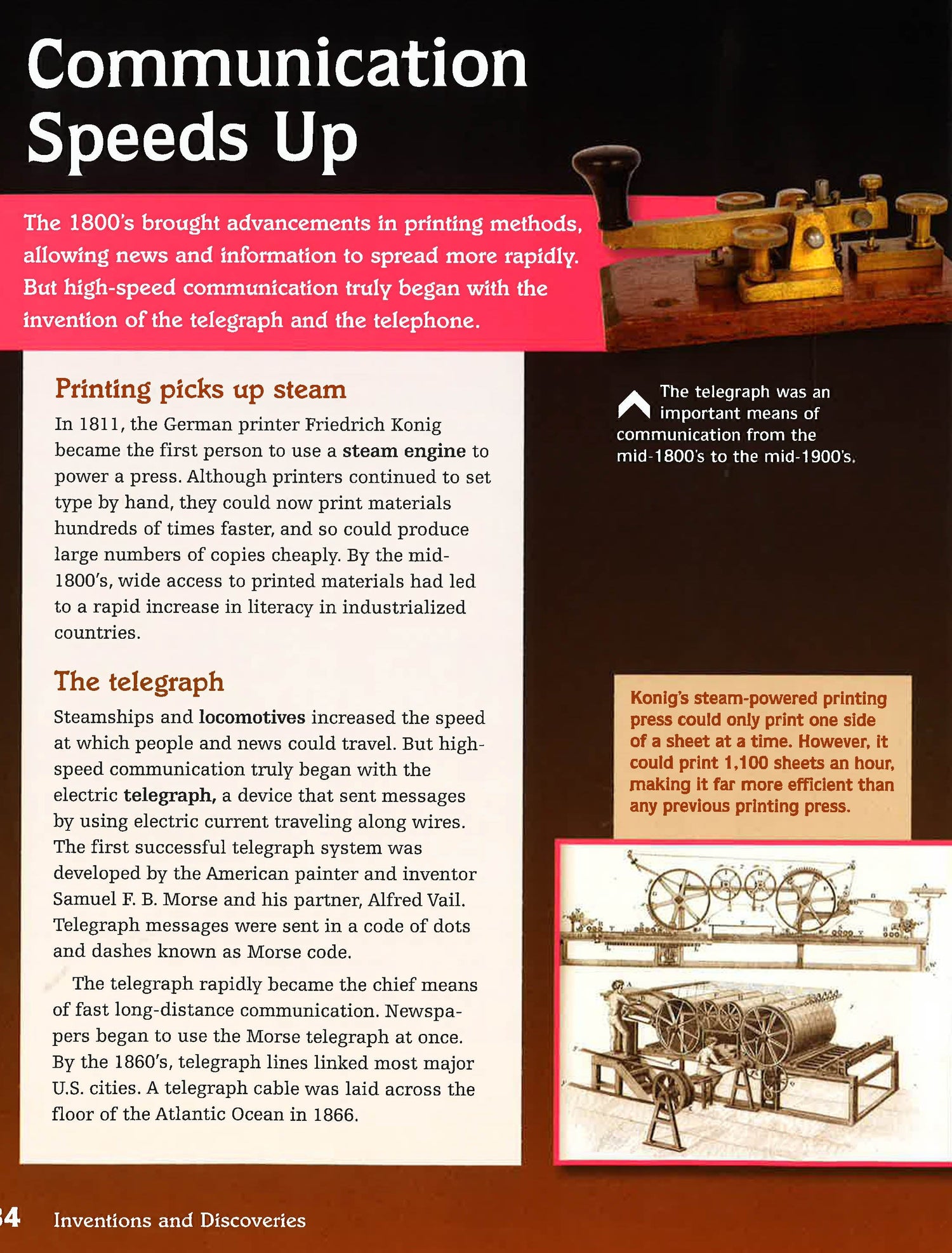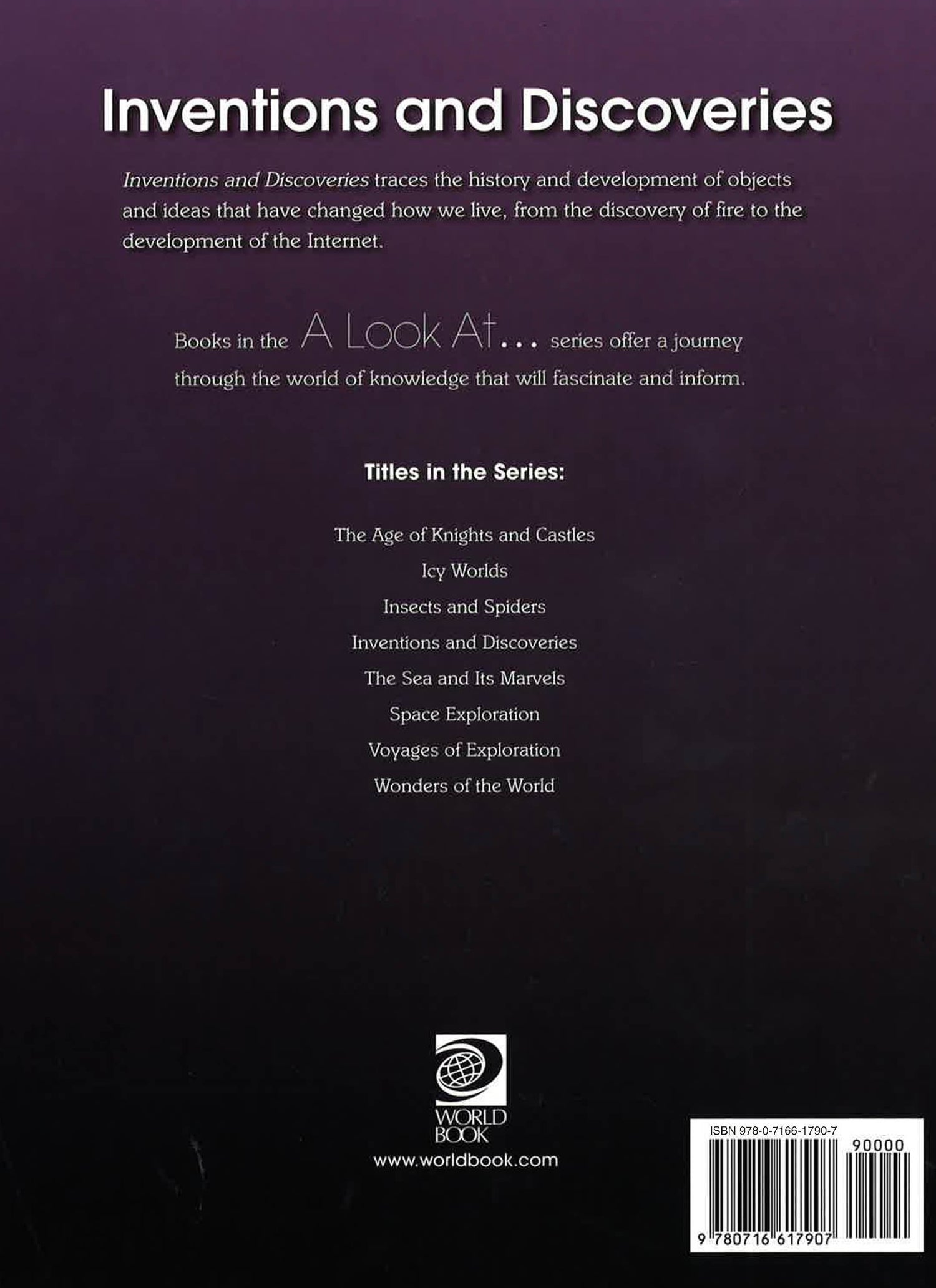 How many sheets of paper was the Gutenberg printing press capable of printing in a day? What were the first words spoken over a telephone? Who were the first people to use magnetic compasses for navigation? How did Copernicus change the way we look at Earths place among the planets? Inventions and Discoveries traces the history and development of objects and ideas that have changed how we live, from the discovery of fire to the development of the Internet. With Inventions and Discoveries, kids will learn about the milestones in such areas as communication, transportation, and astronomy.With striking photographs and illustrations, World Books A Look At series takes children on a journey through different ages and locations around the globe and beyond. Perfect for visual learners, each nonfiction book creatively explores high-interest topics with ample illustrations and concise text that help readers absorb and retain information. Helpful glossaries and indexes in each volume direct students to the most important terms and topics. Help learners with a primary reading level of 6th to 8th grade encounter a range of topics in nature, history, science, and technology with World Books A Look At series!