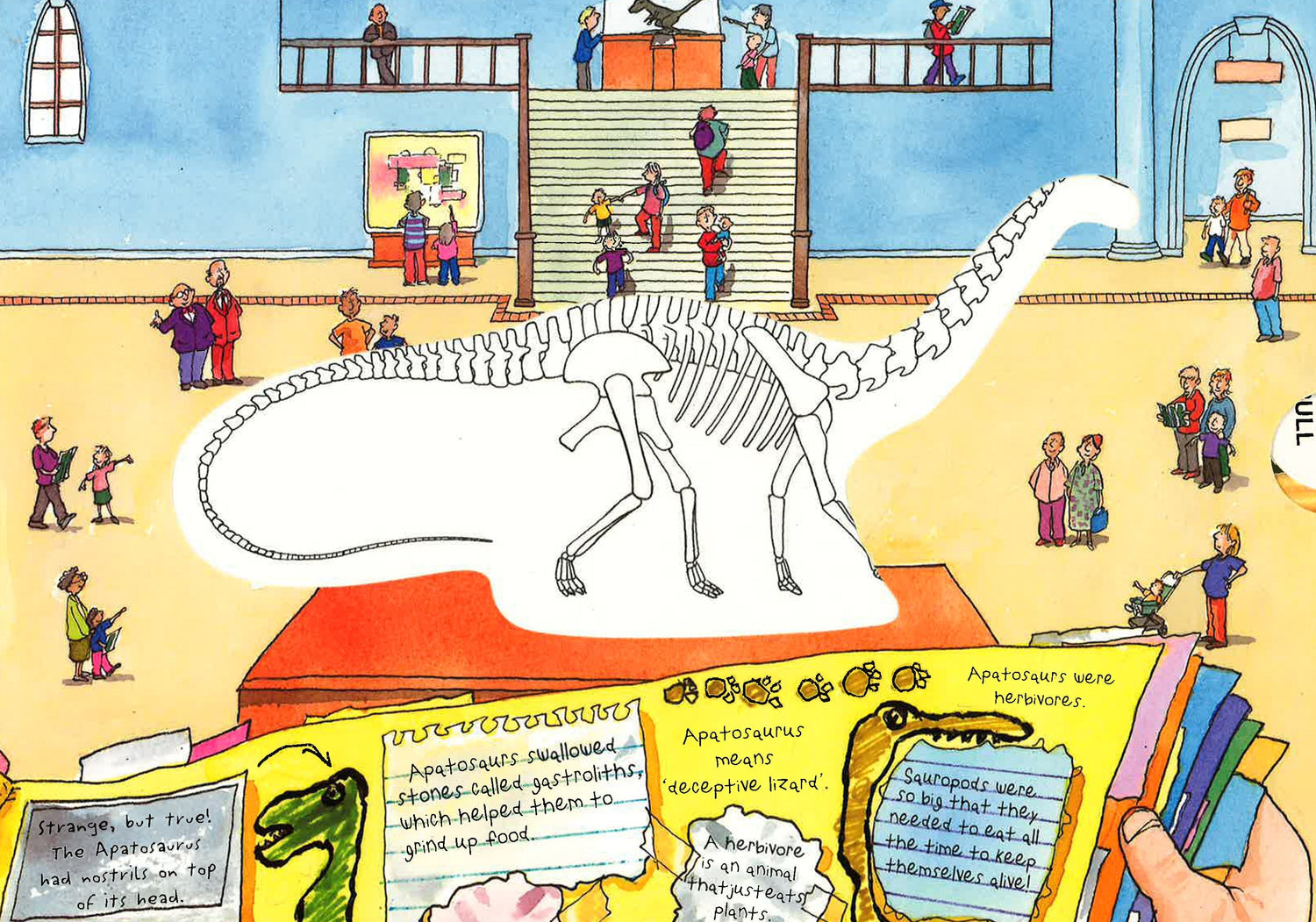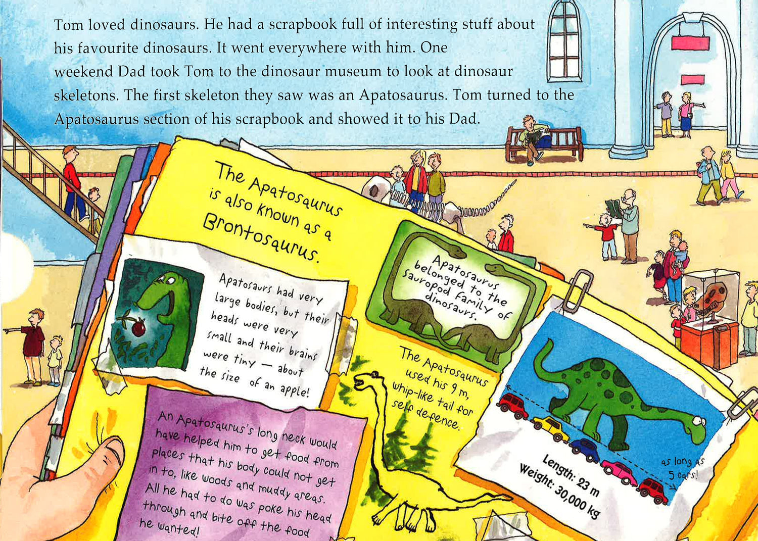 Join Tom and Dad on their trip to the Dinosaur Museum to see the dinosaur skeletons. Discover fascinating facts about a triceratops, a stegosaurus, a corythosaurus, an apatosaurus and a mighty T-Rex. Learn about what their names mean, what they ate, how much they weighed and LOTS more! Then pull the tabs to make the skeletons come alive. Groovy illustrations of Tom's scrapbooking activities during his trip to the museum make this innovative format a winner!5-7 years