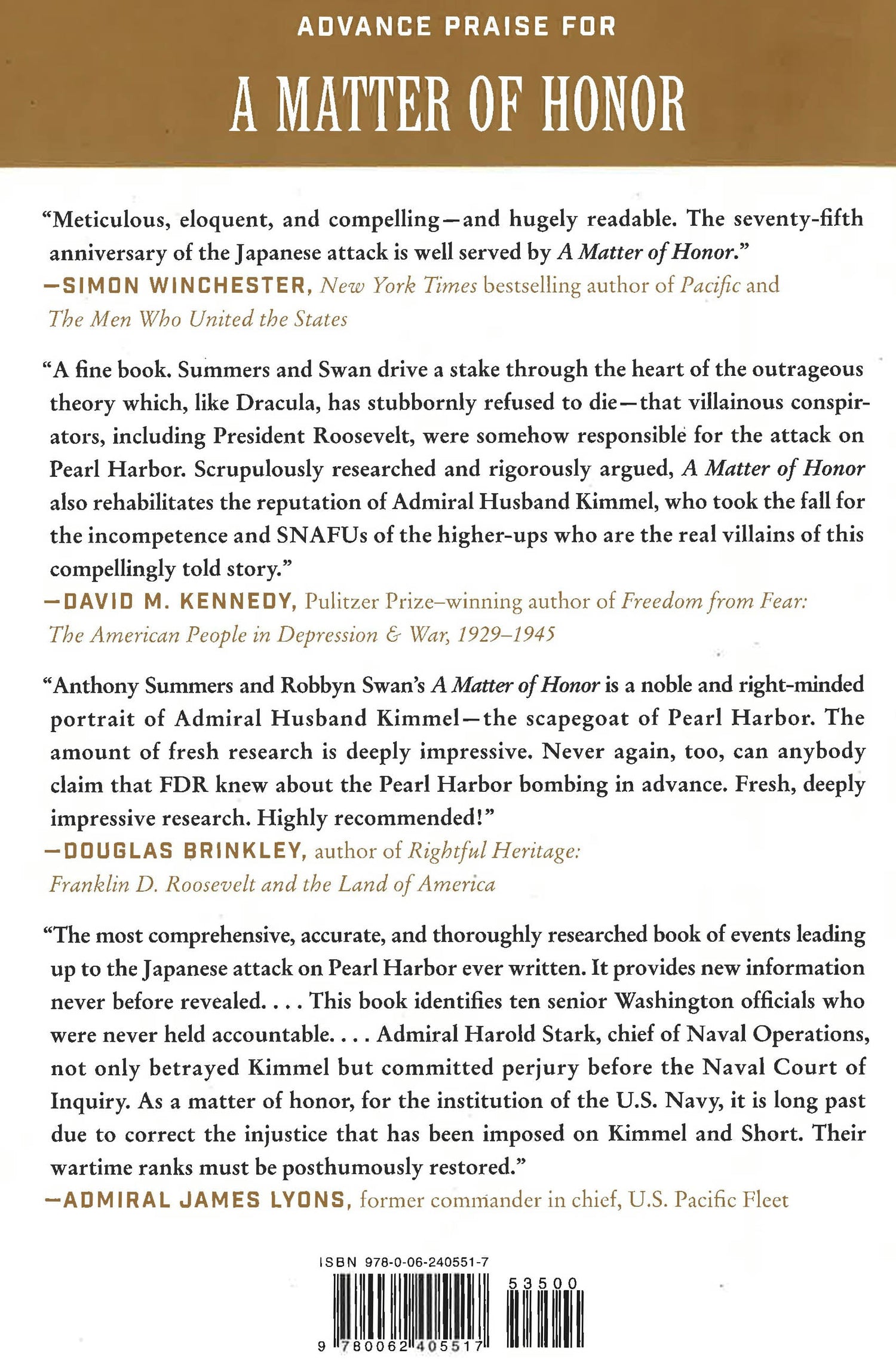 On the seventy-fifth anniversary, the authors of Pulitzer Prize finalist The Eleventh Day unravel the mysteries of Pearl Harbor to expose the scapegoating of the admiral who was in command the day 2,000 Americans died, report on the continuing struggle to restore his lost honor - and clear President Franklin D. Roosevelt of the charge that he knew the attack was coming.The Japanese onslaught on Pearl Harbor on December 7, 1941 devastated Americans and precipitated entry into World War II. In the aftermath, Admiral Husband Kimmel, Commander-in-Chief of the Pacific Fleet, was relieved of command, accused of negligence and dereliction of duty - publicly disgraced.But the Admiral defended his actions through eight investigations and for the rest of his long life. The evidence against him was less than solid. High military and political officials had failed to provide Kimmel and his Army counterpart with vital intelligence. Later, to hide the biggest U.S. intelligence secret of the day, they covered it up.Following the Admiral’s death, his sons - both Navy veterans - fought on to clear his name. Now that they in turn are dead, Kimmel’s grandsons continue the struggle. For them, 2016 is a pivotal year.With unprecedented access to documents, diaries and letters, and the family’s cooperation, Summers’ and Swan’s search for the truth has taken them far beyond the Kimmel story - to explore claims of duplicity and betrayal in high places in Washington.A Matter of Honor is a provocative story of politics and war, of a man willing to sacrifice himself for his country only to be sacrificed himself. Revelatory and definitive, it is an invaluable contribution to our understanding of this pivotal event.The book includes forty black-and-white photos throughout the text.