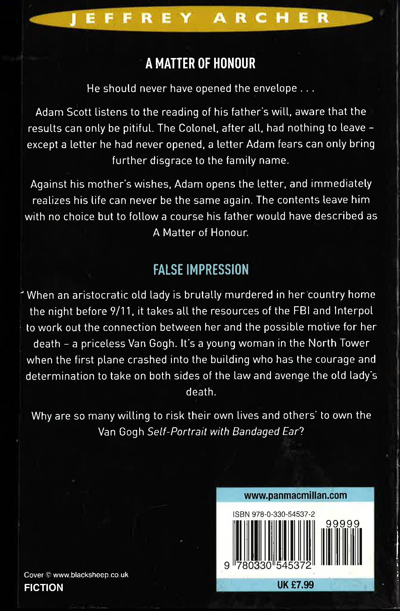 A Matter of Honour - He should never have opened the envelope...Adam Scott listens to the reading of his father's will, aware that the results can only be pitiful. The Colonel, after all, had nothing to leave - except a letter he had never opened, a letter Adam fears can only bring further disgrace to the family name. Against hie mother's wishes, Adam opens the letter, and immediately realizes his life can never be the same again. the contents leave him with no choice but to follow a course his father have described as A Matter of Honour. - False Impression - When an aristocratic old lady is brutally murdered in her country home the night before 9/11, it takes all the resources of the FBI and Interpol to work out the connection between her and the possible motive for her death - a priceless Van Gogh. It's a young woman in the North tower when the first plane crashed in the building who has the courage and determination to take on both sides of the law and avenge the old lady's death. Why are so many willing to risk their own lives and others' to own the van Gogh Self-Potrait with Bandaged Ear?