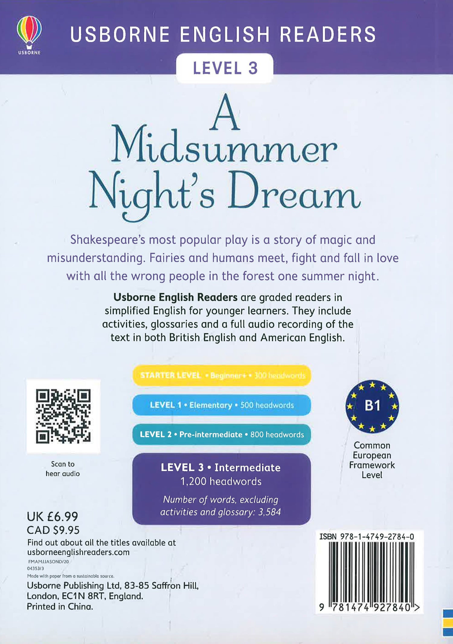 Shakespeare's most popular play is a story of magic and misunderstanding. Fairies and humans meet, fight and fall in love with all the wrong people in the forest one summer night. Includes a word list, 5 pages of activities and free online audio (British English and American English). 1,200 headwords, 3,584 words
