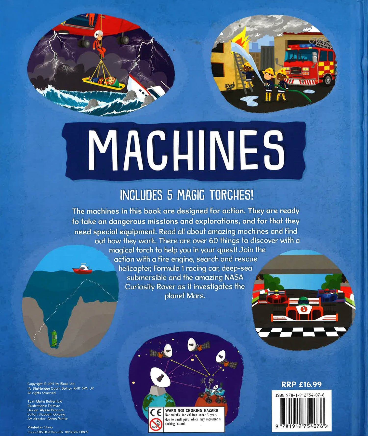 The machines in this book are designed for action. They are ready to take on dangerous missions and explorations, and for that they need special equipment. Read all about amazing machines and find out how they work. There are over 60 things to discover with a magical torch to help you in your quest! Join the action with a fire engine.