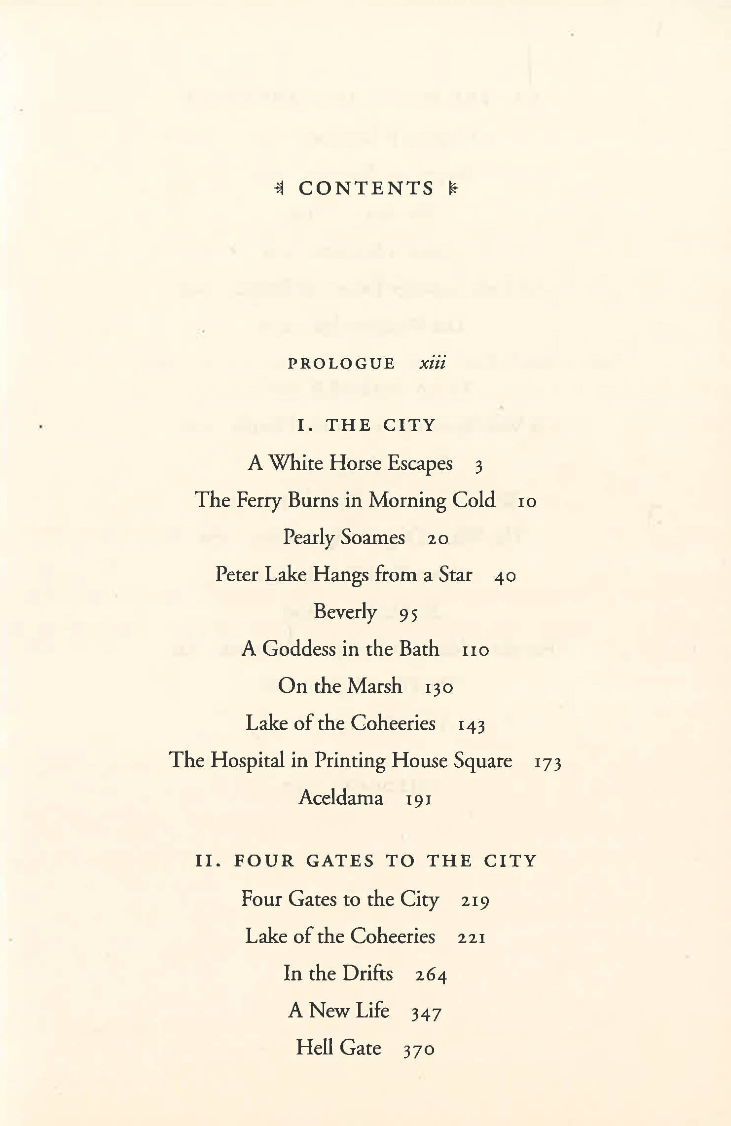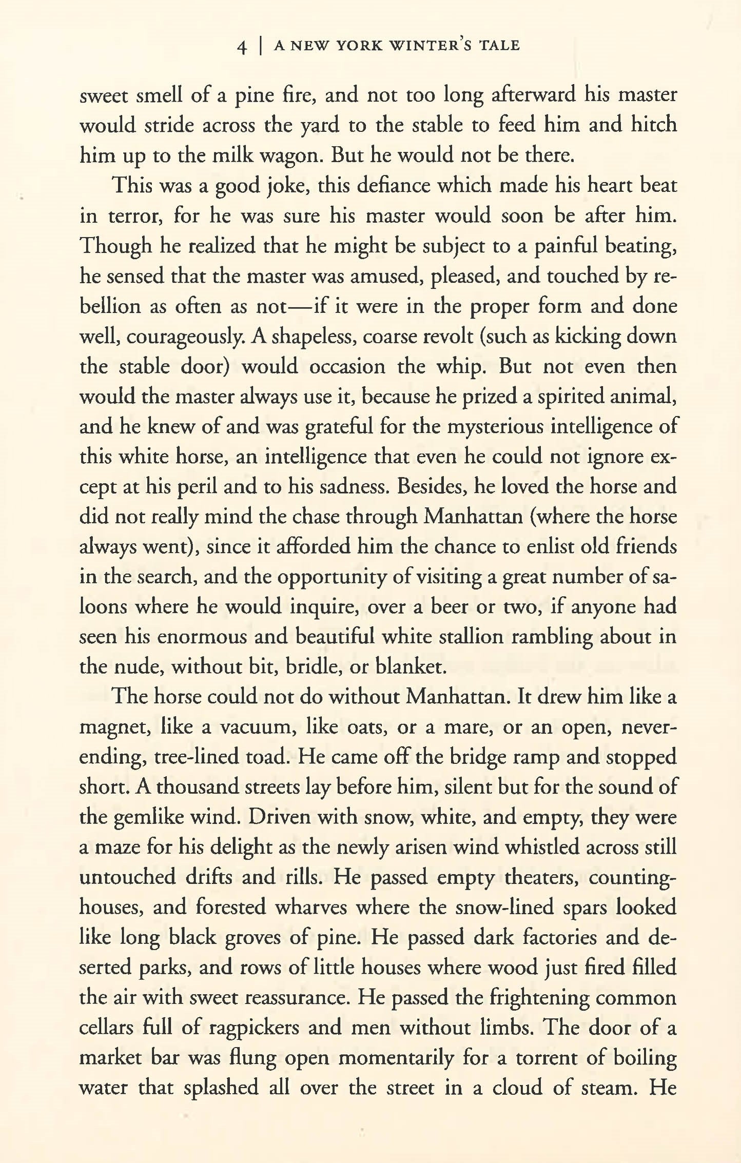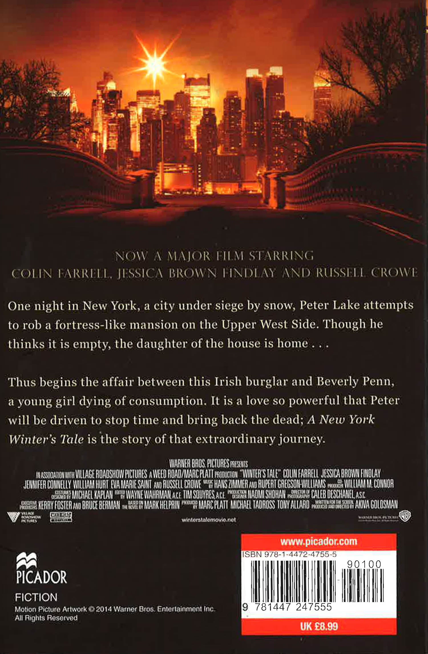 The New York Times No. 1 bestseller. One night in New York, a city under siege by snow, Peter Lake attempts to rob a fortress-like mansion on the Upper West Side. Though he thinks it is empty, the daughter of the house is home ...Thus begins the affair between this Irish burglar and Beverly Penn, a young girl dying of consumption. It is a love so powerful that Peter will be driven to stop time and bring back the dead; A New York Winter's Tale is the story of that extraordinary journey.