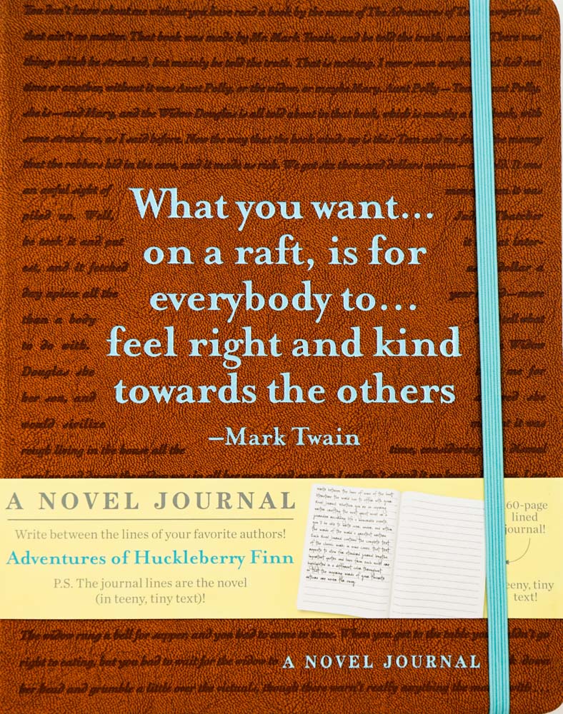 A Novel Journal: Adventures of Huckleberry Finn allows fans to lose themselves in the book?s pages each time they sit down to write. A fun literary keepsake, the journal features the entire text of Twain?s work in tiny print that serves as page lines. Whether used to craft the latest political commentary or to serve as a daily record of events, the words of Mark Twain are likely to add inspiration to any writing endeavor.