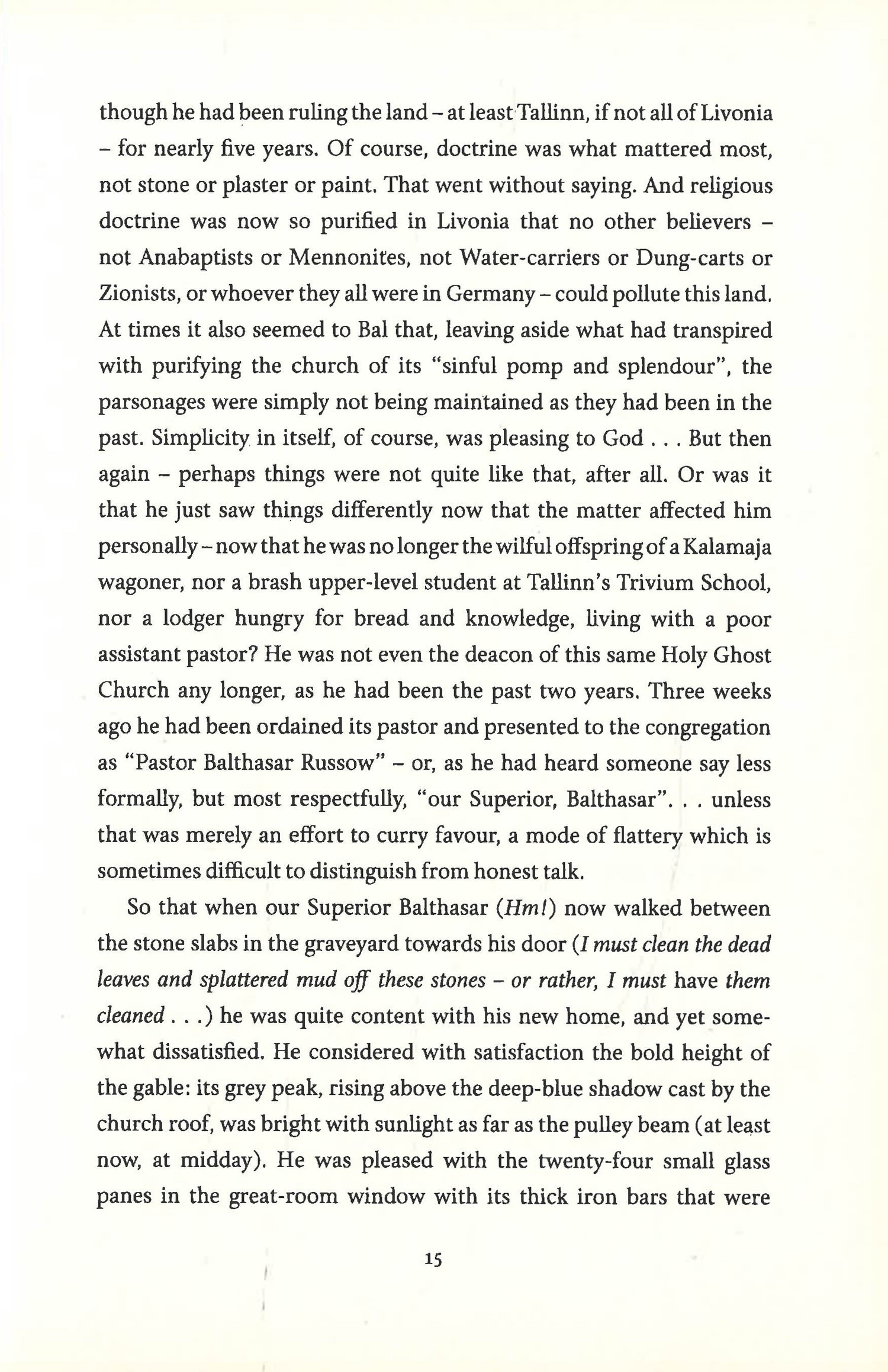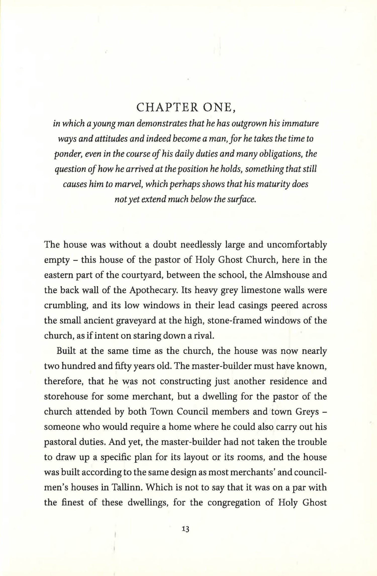 The year is 1563, and by any account Balthasar Russow can be said to have risen in the world. Fresh from his studies in the German town of Stetten, he has assumed the role as pastor of Tallinn's Holy Ghost Church. Moreover, he is betrothed to a maiden of the town - much to the chagrin of her father, who has no wish to welcome peasant stock to the family when there is no shortage of upstanding young German men - and is poised to begin the chronicle that will ensure his everlasting fame.