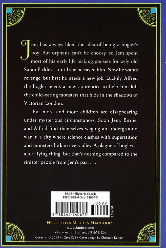 Jem Barbary spent most of his early life picking pockets for a wily old crook named Sarah Pickles--until she betrayed him. Now Jem wants revenge, but first he needs a way to earn his living. He'd like to work for the bogler Alfred Bunce, who kills the child-eating monsters that lurk in the cellars and sewers of old London. But Alfred has wanted to give up bogling ever since he almost lost his last apprentice, Birdie McAdam. As more and more children disappear under mysterious circumstances, though, Alfred, Jem, and Birdie find themselves waging an underground war. Soon they discover that there's only one thing more terrifying than facing a whole plague of bogles: facing the sinister people from Jem's past . . .