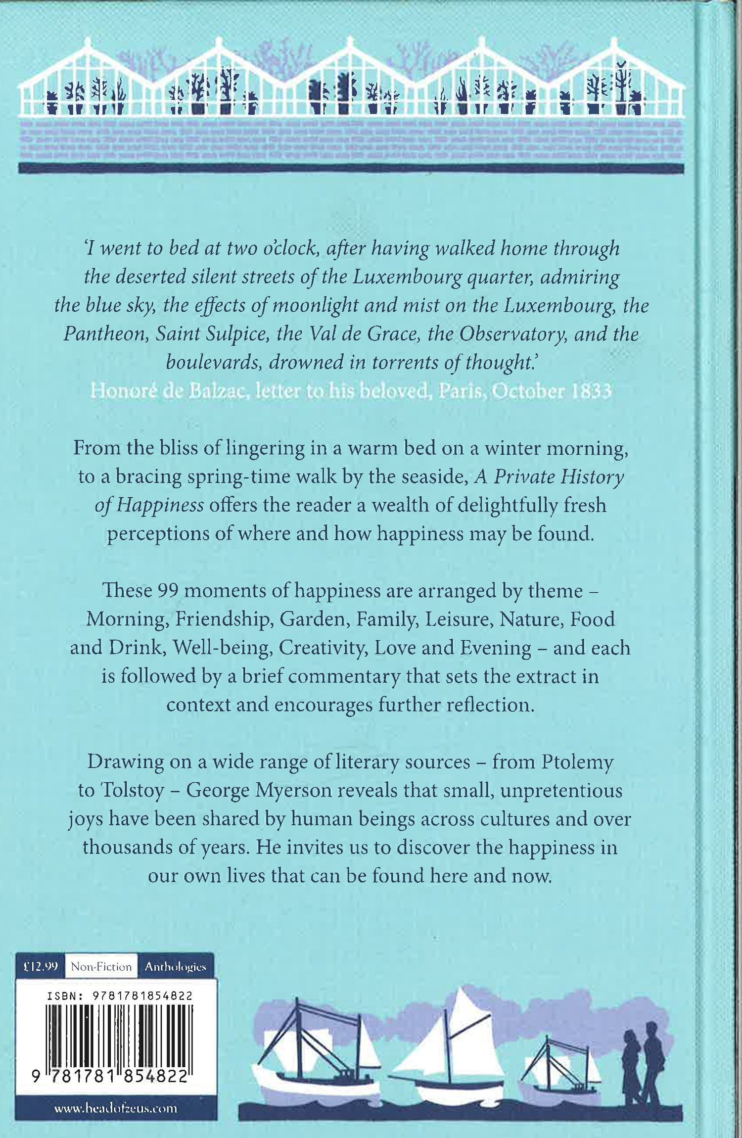 From the bliss of lingering in a warm bed on a winter morning, to a bracing springtime walk by the seaside, A PRIVATE HISTORY OF HAPPINESS offers the reader a wealth of delightfully fresh perceptions of where and how happiness may be found. These 99 moments of happiness are arranged by theme - Morning, Friendship, Garden, Family, Leisure, Nature, Food and Drink, Well-being, Creativity, Love and Evening - and each is followed by a brief description and commentary that sets the extract in context and encourages further reflection. Drawing on a wide and international range of literary sources - from Ptolemy to Tolstoy - George Myerson reveals that small, unpretentious joys have been shared by human beings across cultures and over thousands of years. He invites us to discover the happiness in our own lives that can be found here and now. *This book may have minor shelfwear.
