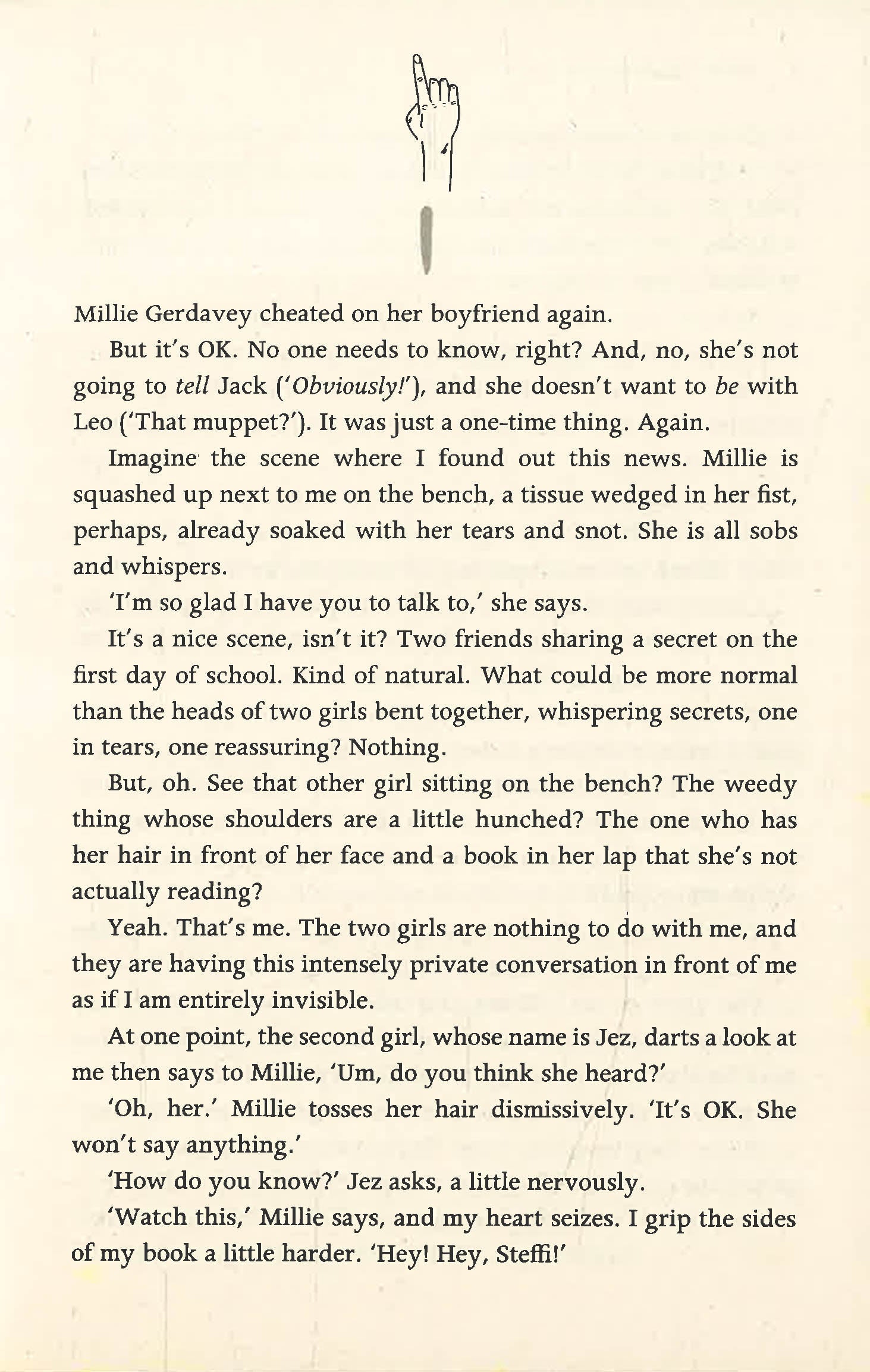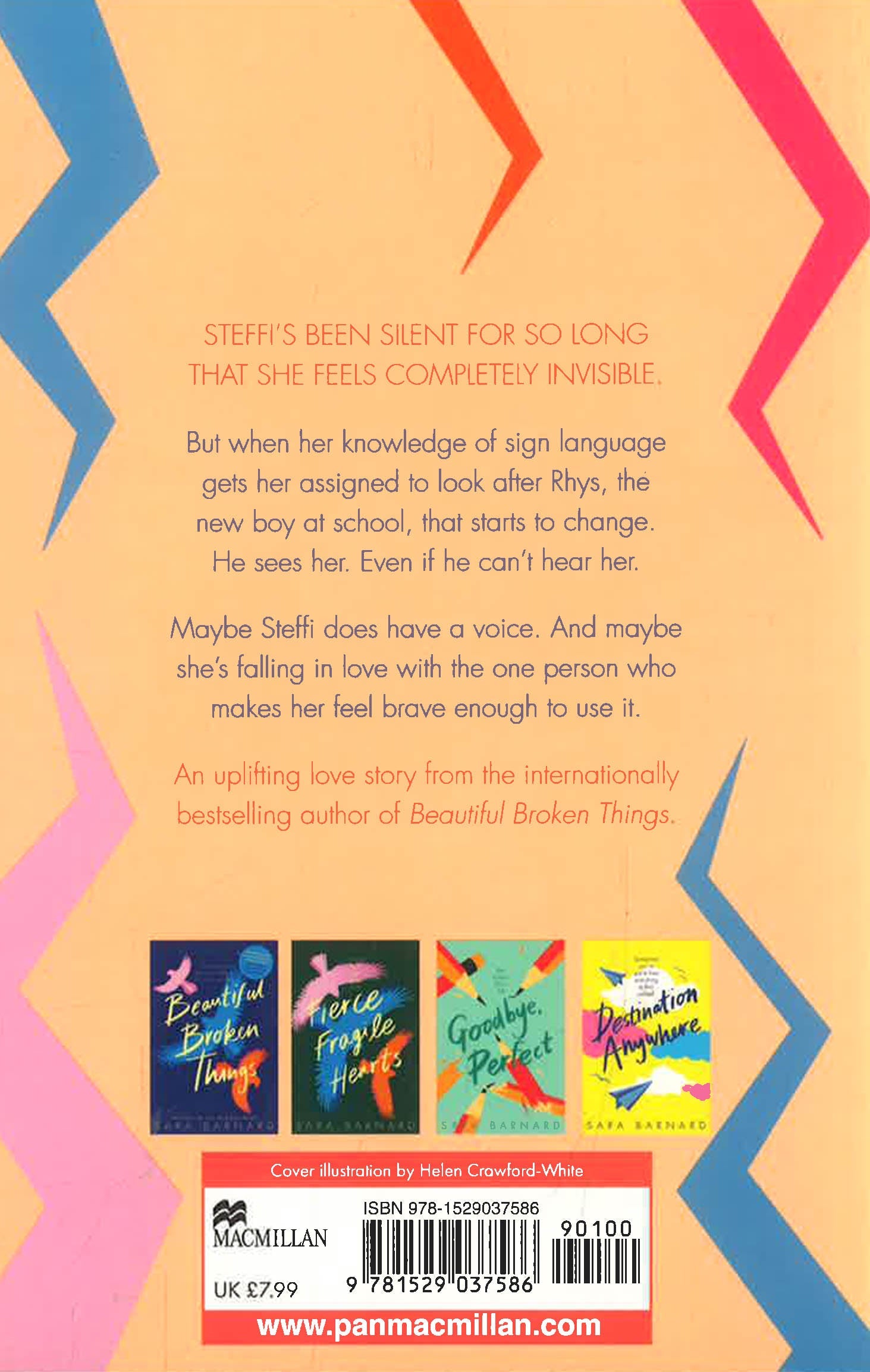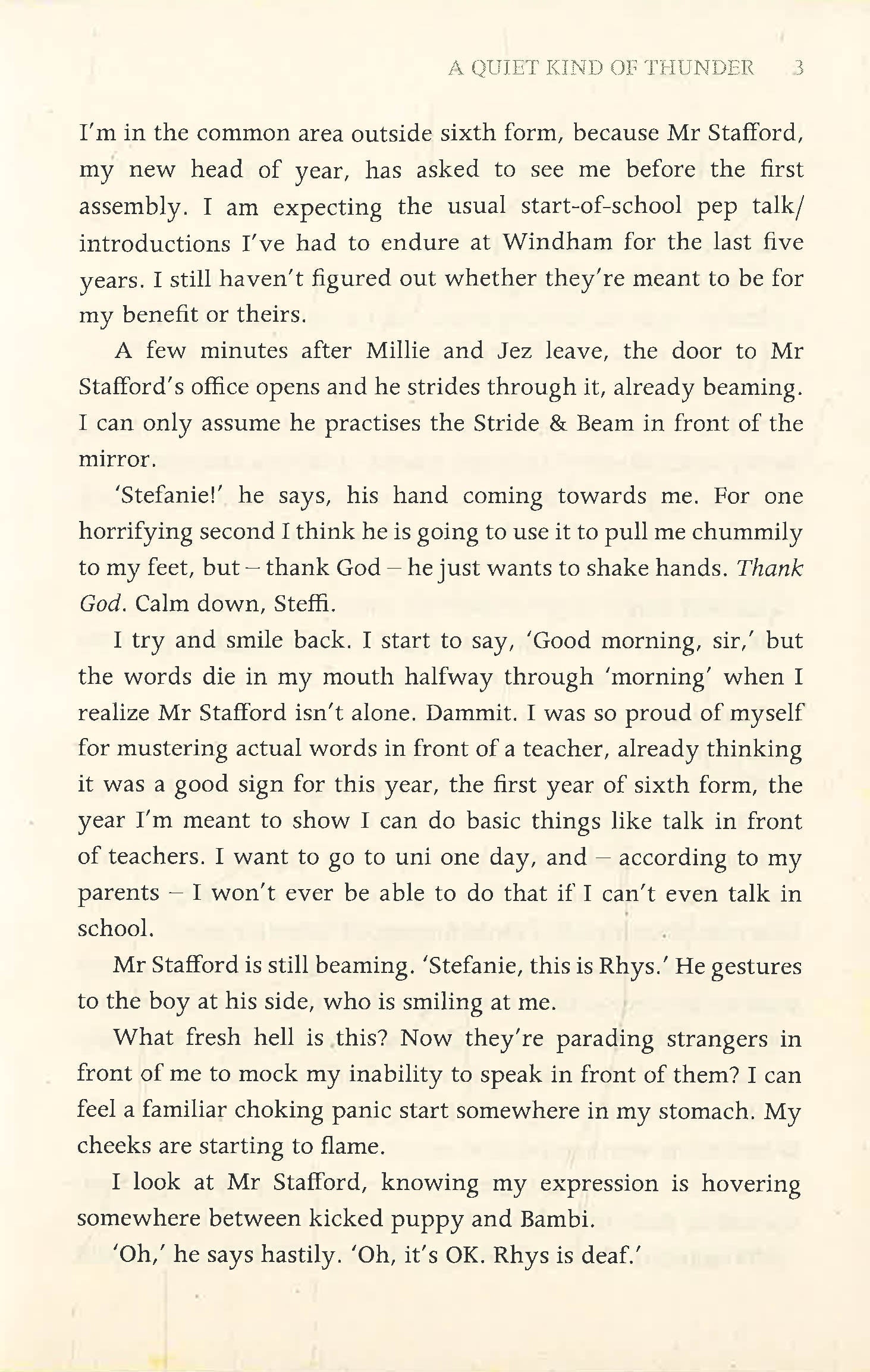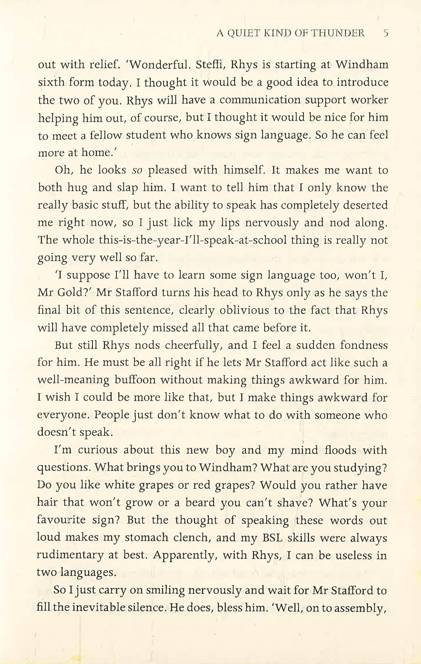 Steffi has been a selective mute for most of her life – she's been silent for so long that she feels completely invisible. But Rhys, the new boy at school, sees her. He's deaf, and her knowledge of basic sign language means that she's assigned to look after him. To Rhys it doesn't matter that Steffi doesn't talk and, as they find ways to communicate, Steffi finds that she does have a voice, and that she's falling in love with the one person who makes her feel brave enough to use it.