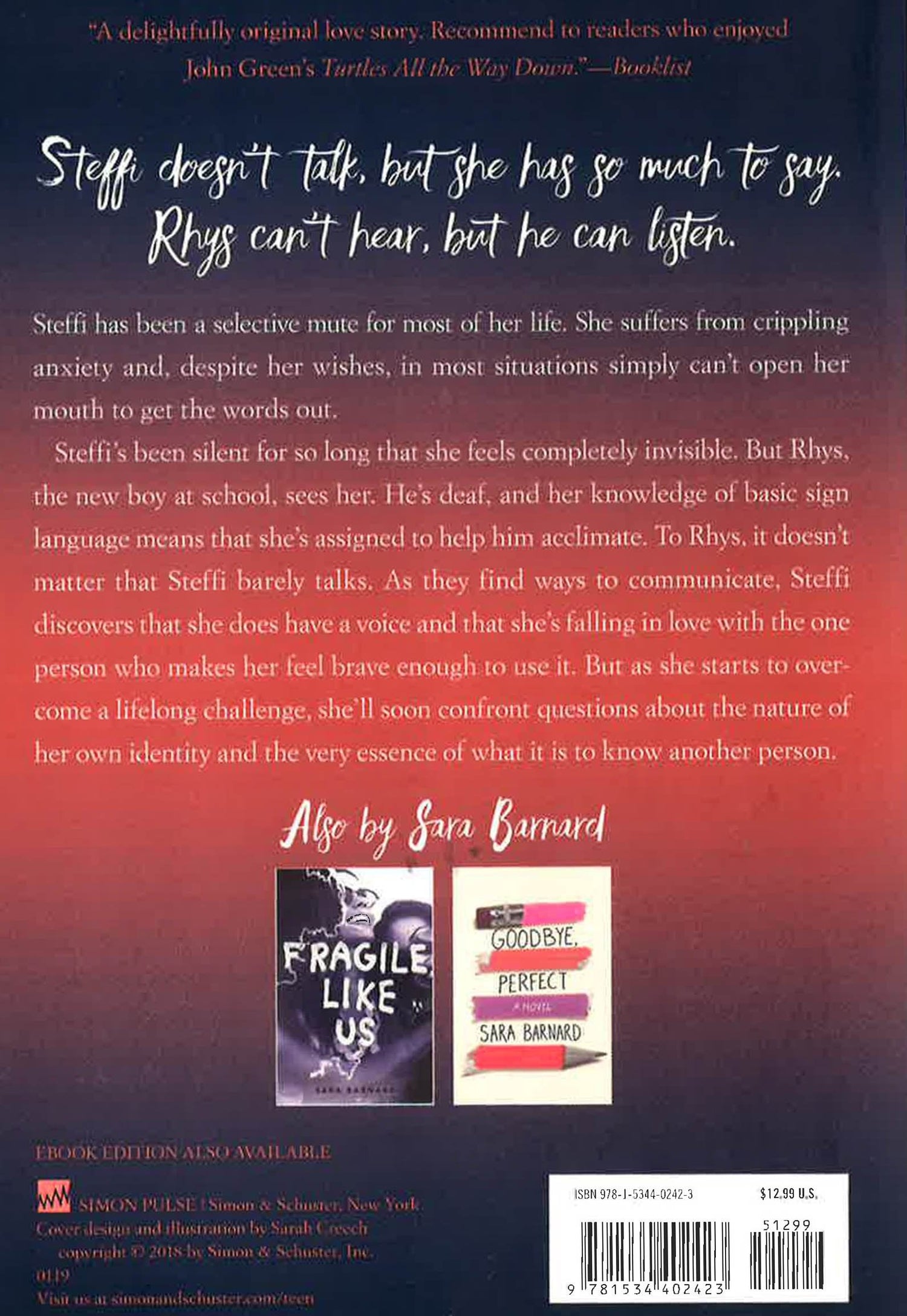 Perfect for fans of Morgan Matson and Jandy Nelson. A girl who can't speak and a boy who can't hear go on a journey of self-discovery and find support with each other in this gripping, emotionally resonant novel for "readers who enjoyed John Green's Turtles All the Way Down" (Booklist) from bestselling author Sara Barnard. Steffi doesn't talk, but she has so much to say.