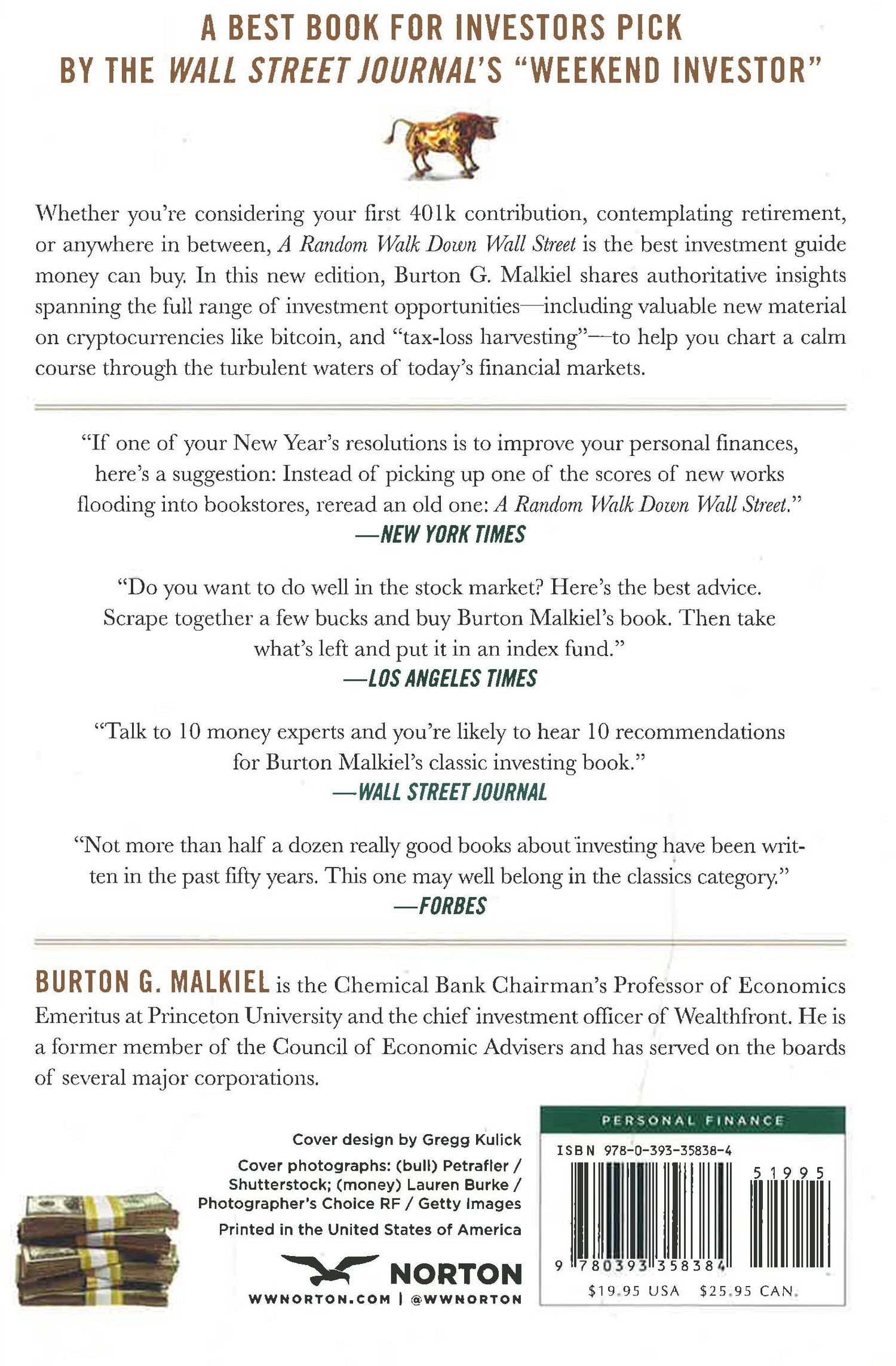 Today's stock market is not for the faint hearted. At a time of frightening volatility, the answer is to turn to Burton G. Malkiel's advice in his reassuring, authoritative, gimmick-free and perennially best-selling guide to investing. Long established as the first book to purchase before starting a portfolio, A Random Walk Down Wall Street now features new material on "tax-loss harvesting"; the current bitcoin bubble and automated investment advisers; as well as a brand-new chapter on factor investing and risk parity. And as always, Malkiel's core insights-on stocks and bonds, as well as investment trusts, home ownership and tangible assets like gold and collectibles-along with the book's classic life-cycle guide to investing, will help restore confidence and composure to anyone seeking a calm route through today's financial markets.